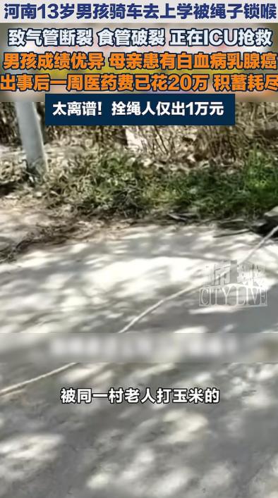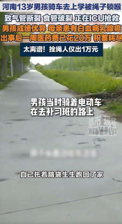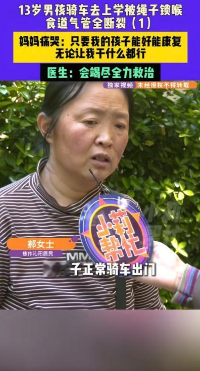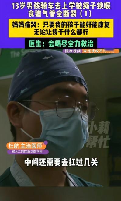 河南焦作13岁男孩被绳索锁喉,食管和气管割断,他居然硬生生的托着脑袋回了家,现在事态很严重,人还在ICU抢救!