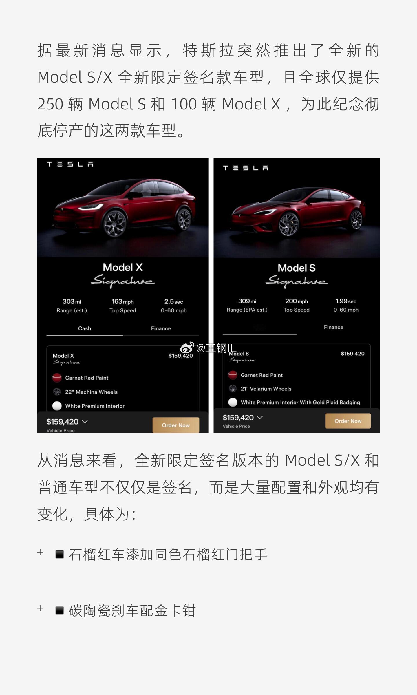 特斯拉推出限量金漆签名版ModelS/X,全球仅250辆,售价109万起,需官方邀请。特斯拉