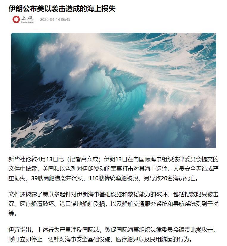 4月13日伊朗给国际海事机构交了一份文件,把美国和以色列打它造成的海上损失,说得明明白白。