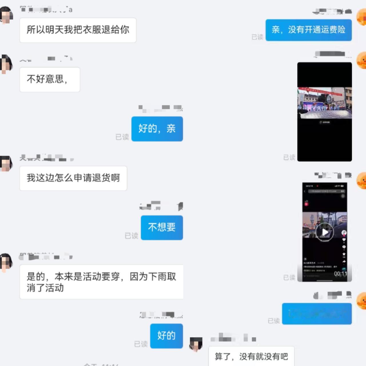 原来,几天之后,这些学生家长就陆续开始退货,20套演出服已经有11套退货了,给出的退货理由是因为下雨,演出活动取消了。