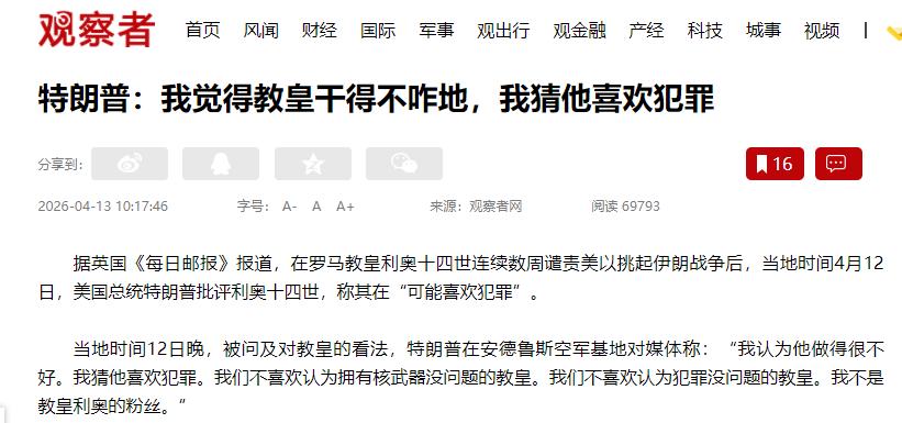 英国《每日邮报》都报道了,教皇4月11号还在祈祷仪式上喊“别炫耀武力,别打仗”,还说美以的做法太狂妄,打民用设施既违法,又伤人。