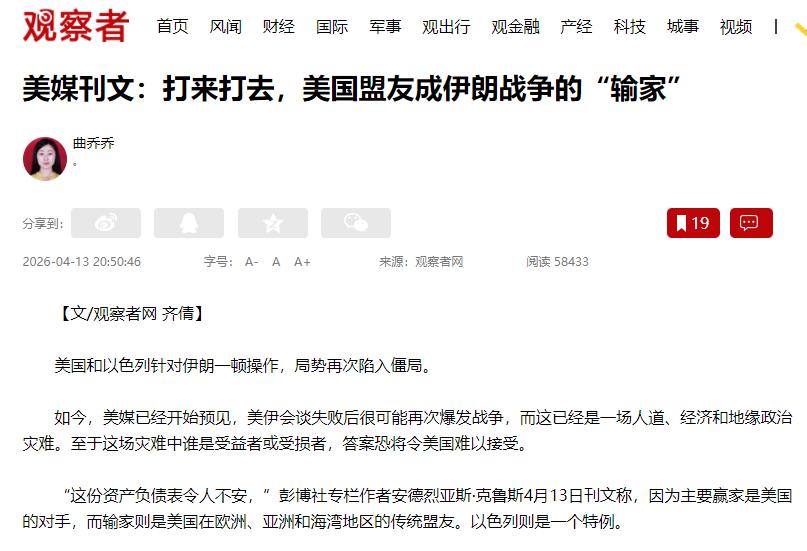 彭博社4月13号有个作者发文说,这场乱局里,赢家是美国的对手,输家全是跟着美国混的盟友,只有以色列是个例外。