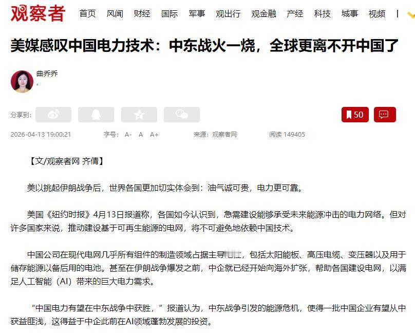 就连美国《纽约时报》4月13号都坦言,现在各国都急着建能扛住能源危机的电网,但想搞靠太阳能、风能的电网,根本绕不开中国技术——中东这仗一打,全球更离不开中国电力了。