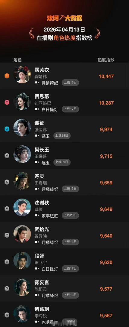 鞠婧祎《月鳞绮纪》露芜衣猫眼剧集角色热度第14周周榜冠军欢网在播剧角色热度排名第