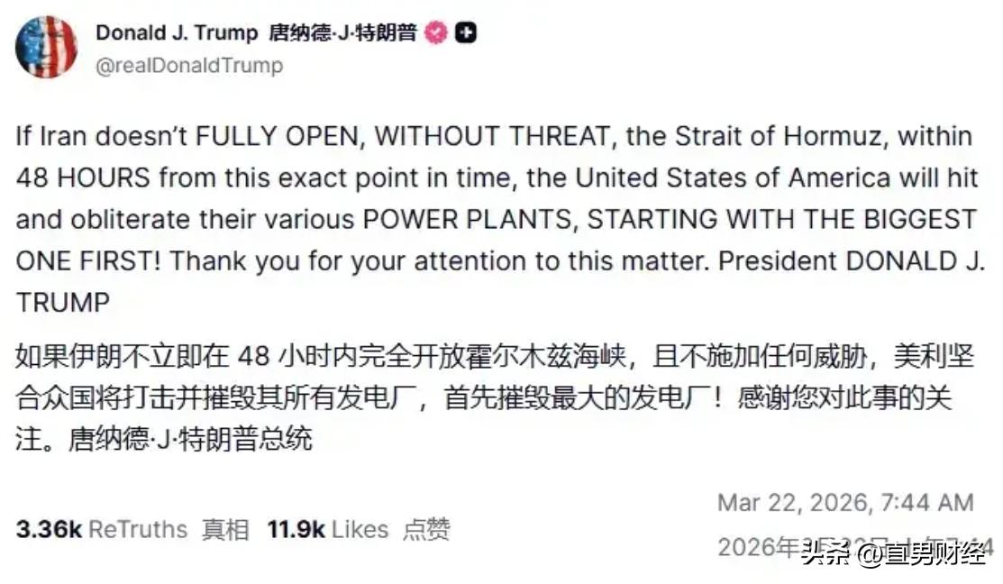 全球股市先齐刷刷暴跌,同时原油价格大涨10%,因为特朗普早些时候在社交平台上宣布要炸了伊朗发电厂,拆了人家的家。