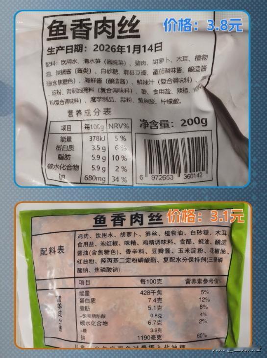 阿祖:最主要的区别还是一个用的是猪肉,一个是鸡肉。猪肉的成本是一定比鸡肉要高一些的,而且它也更还原了鱼香肉丝传统的做法。然后它的钠含量也低一些,无论是从健康还是从口味来说,它都是一份更好的鱼香肉丝。对于消费者来说,不要一看到这些配料或者原材料上有大量的这种化学名词就会感觉害怕,能写在配料表里面肯定都是安全的。真正不安全的是那些没有写在配料表里面的违规添加的东西。没有任何一个贼会把贼字写在自己的脑门上的。