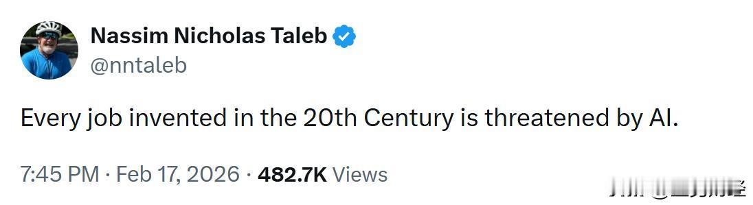之前,《黑天鹅》的作者塔勒布表示,20世纪发明的所有职业,几乎都难逃AI的冲击。