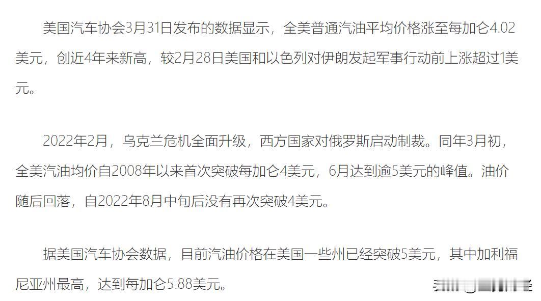 美国虽然是产油大国(每天约1300万桶),但也是用油大国(每天约2000万桶),这个缺口虽然不大,但石油是全球统一定价,美国进口的那部分原油,也得按飙升的国际油价来付费。