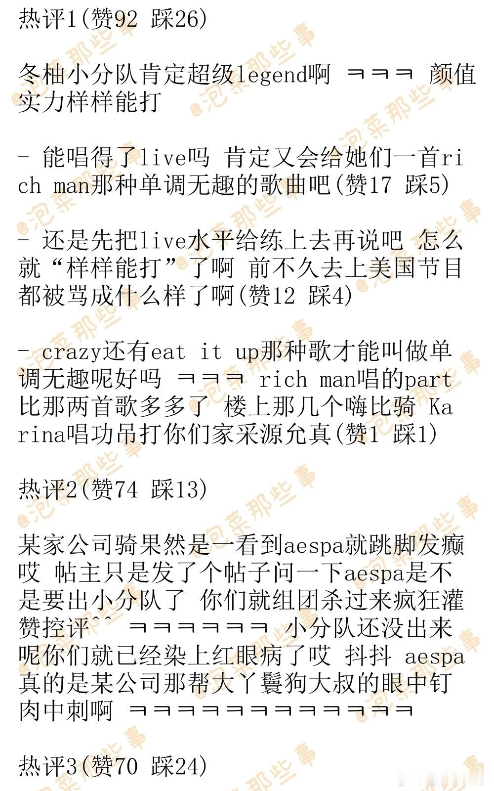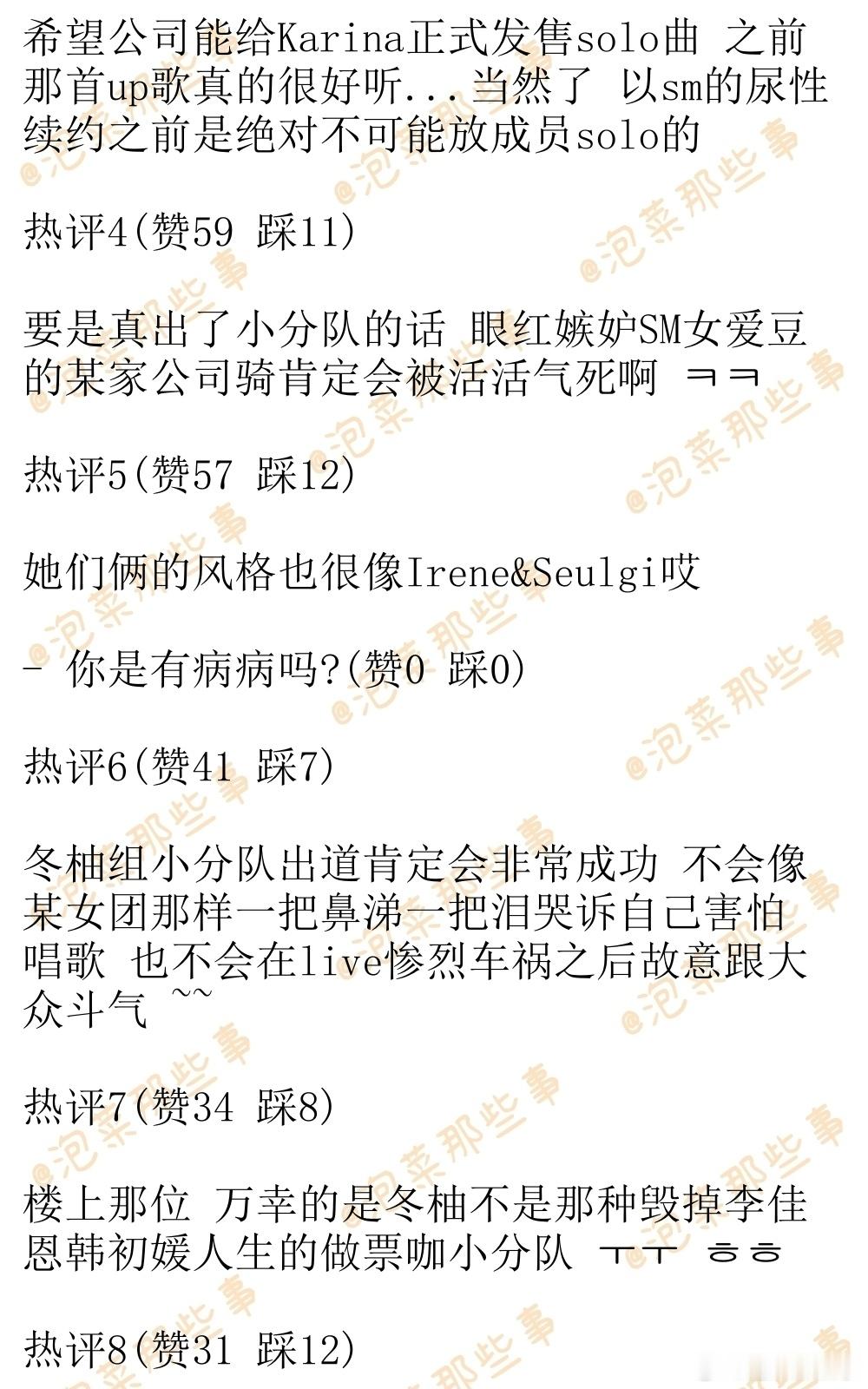 🔥韩网热帖评论翻译🔥aespa柳智敏金玟庭是不是要组小分队出道了啊?韩网原帖帖主发问:Karina和Winter是不是要组小分队出道了啊? 演唱会上安排了双人舞台哎 NINGNING和吉赛尔也有双人舞台 公司会安排她们这样两两分组出道吗 aespa也已经到了出小分队的年次了哎cr.pann