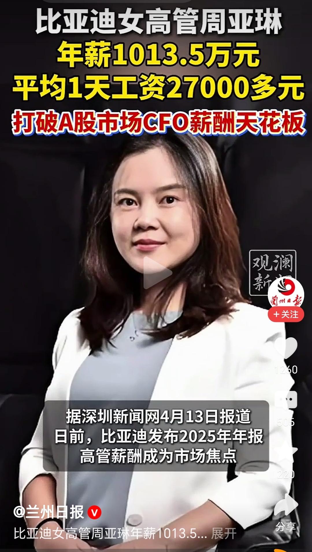 比亚迪女高管薪酬达1013.5万,这消息一出瞬间引发热议!