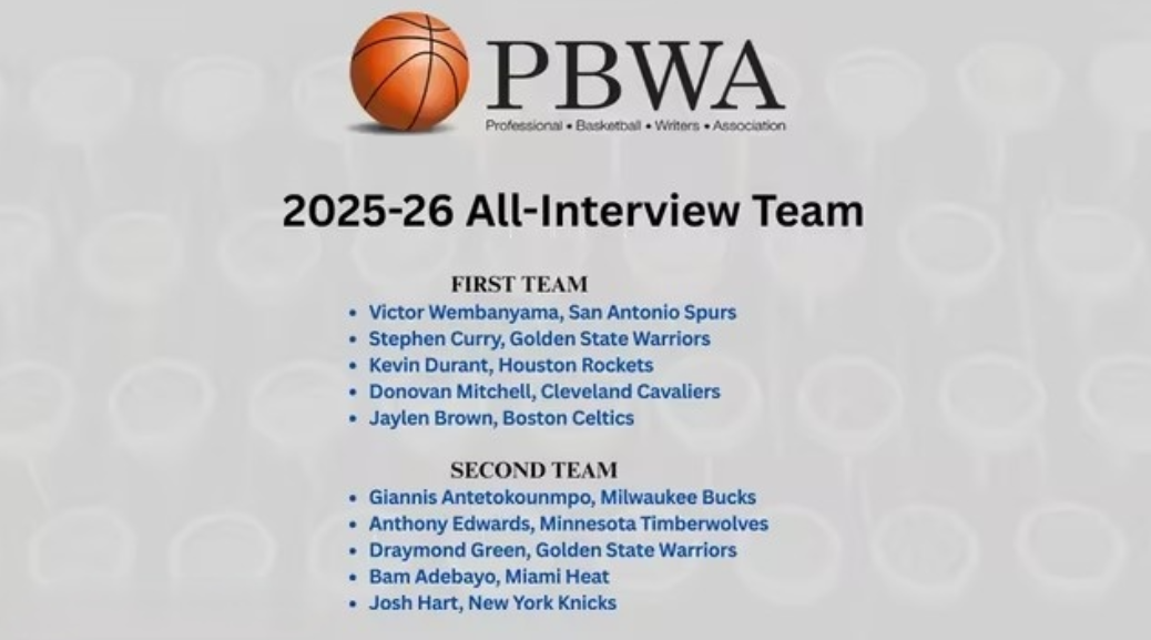 最佳媒体采访阵容一阵:文班亚马、库里、杜兰特、米切尔、布朗;