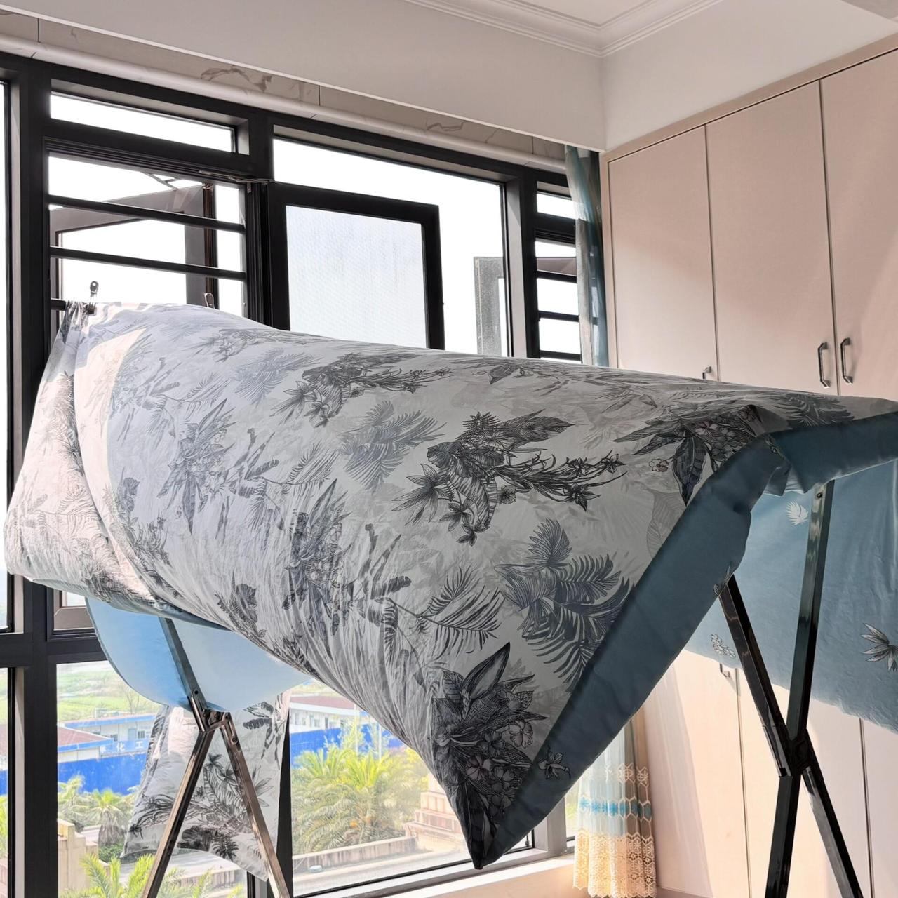 把被套口对着窗户,风一吹,被子就鼓起来,干得很快!