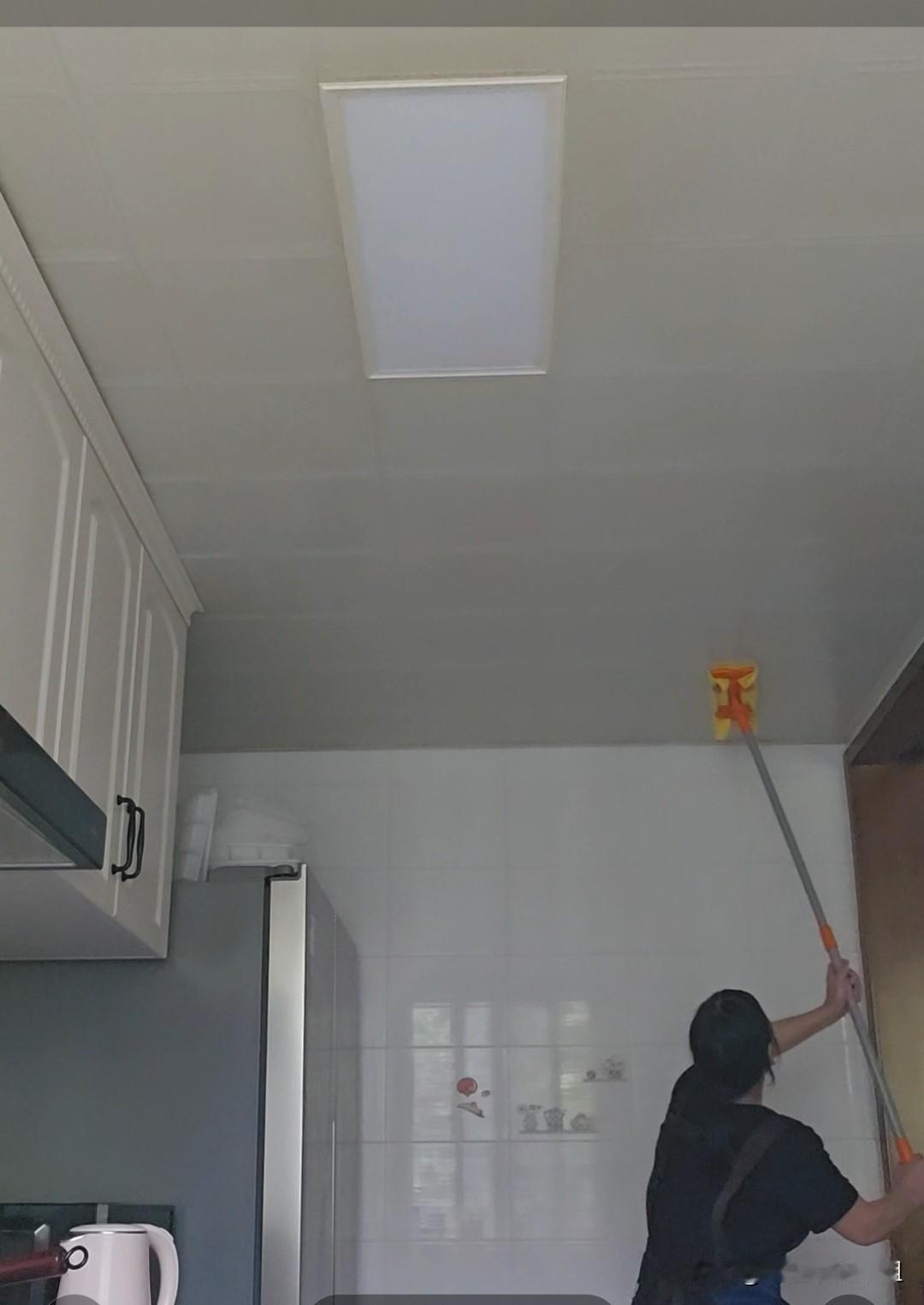 这家客户半月打扫一次,今天我用平板拖夹上毛巾,把他家厨房的吊顶和墙壁都仔细擦了一遍。