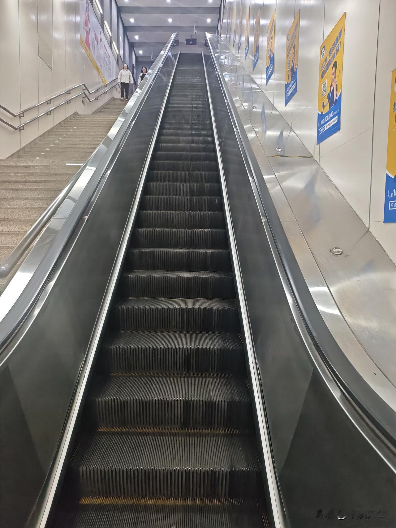 地铁入口的楼梯很长。这个移动扶梯是从地铁出去时可以乘坐,进入地铁只能走楼梯下来。北京绝大部分的地铁入口的扶梯都是这种,要么只能进,要么只能出,另一个方向只能走楼梯。