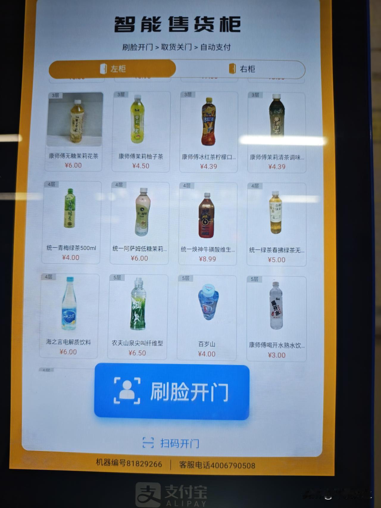 这个售货柜里卖的康师傅瓶装饮料价格是4.5。这些饮料在超市或小卖部里应该是3元或3.5元。售货机里的价格稍贵一点,还在可接受范围内。