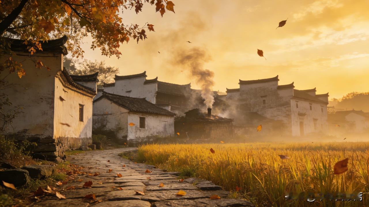远山树木笼着薄薄轻烟,枯黄的残叶随风簌簌落下,铺在乡间小路上。