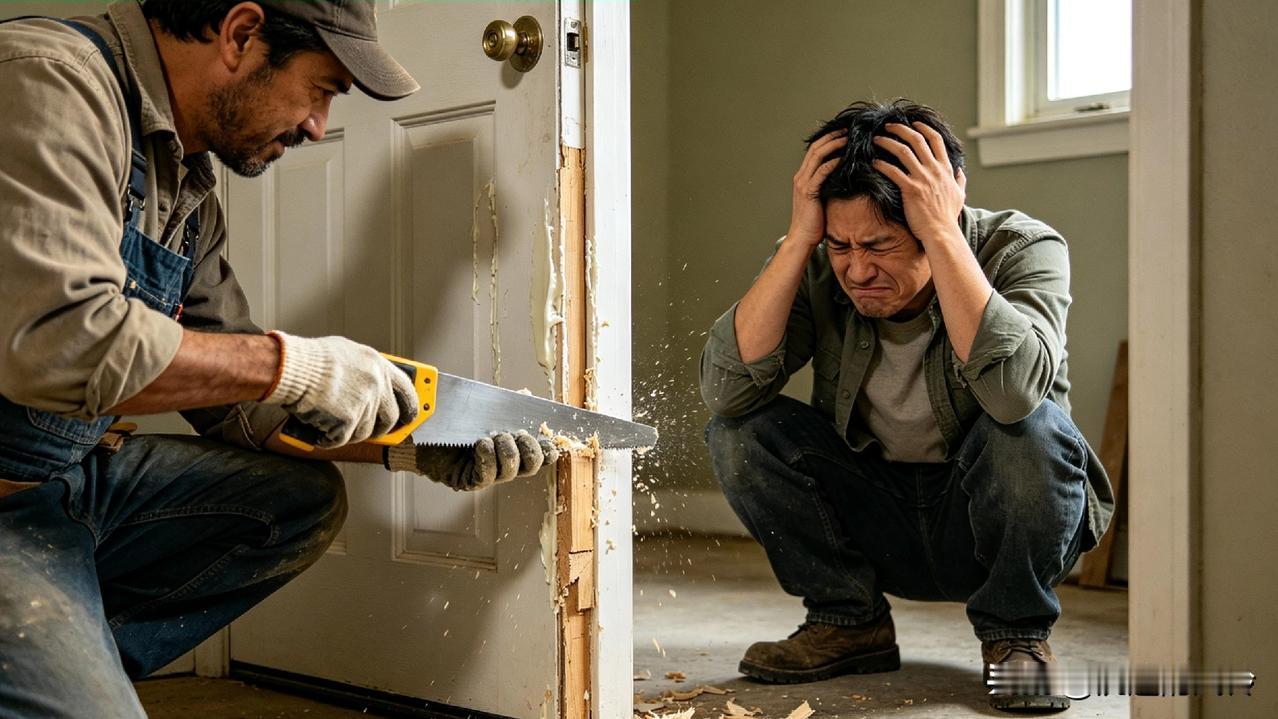 好好的一扇新防盗门,硬生生被锯成两半,衣柜没修好,换门反倒花了两千多,表哥蹲在门口懊恼得直拍大腿,全家人都笑他贪小便宜吃大亏。