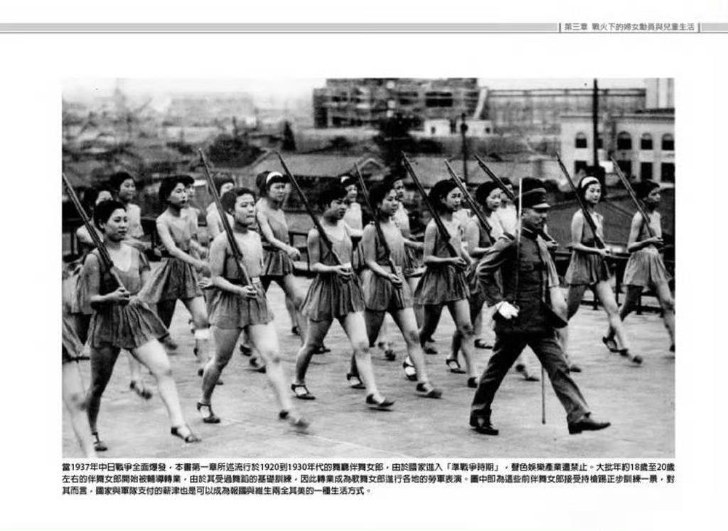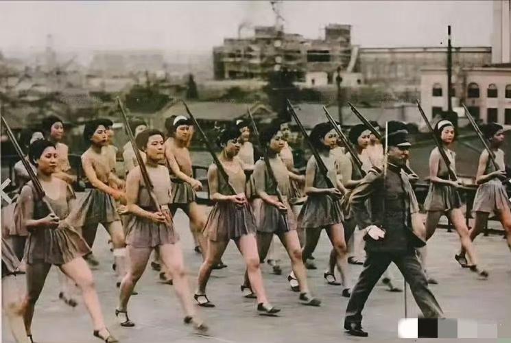 照片里,一群年轻女子身着短裙,手持步枪,迈着整齐的步伐接受日军军官检阅。她们不是正规军,而是原本在舞厅里跳舞的舞女。