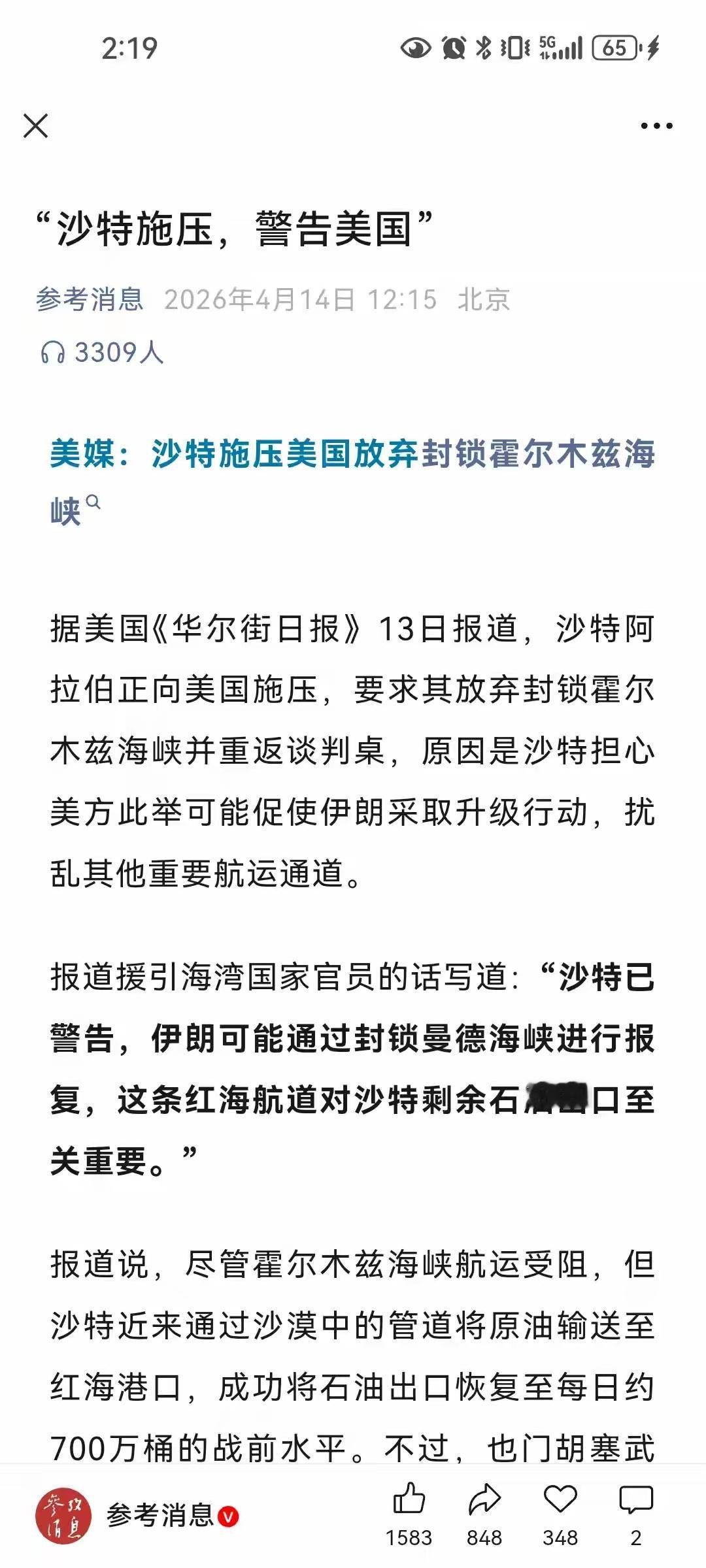 不管怎么着,沙特这回牛叉了,敢对美国大声说话了。据说沙特施压美国放弃封锁霍尔木兹海峡。