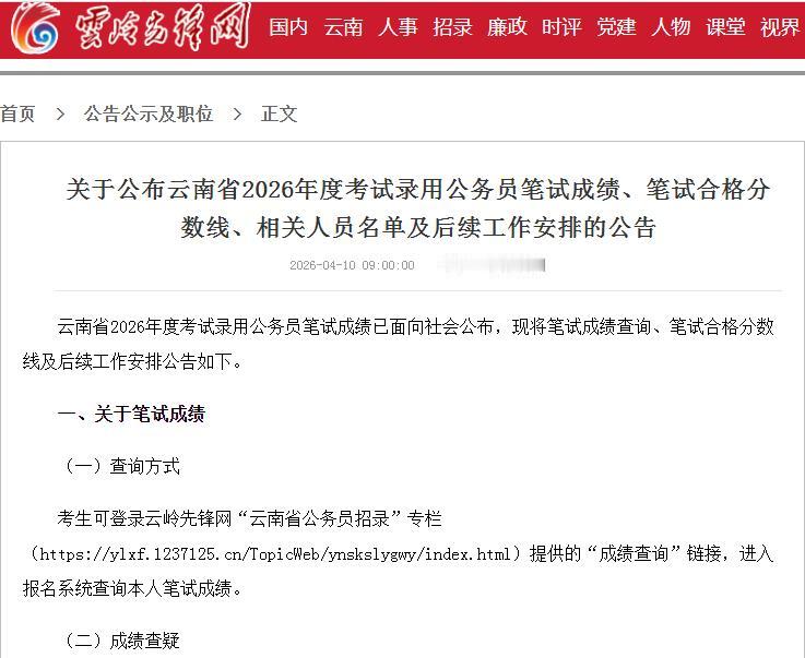 4月10日上午9时,云南省公布了2026年度考试录用公务员笔试成绩、笔试合格分数线、相关人员名单及后续工作安排的公告。