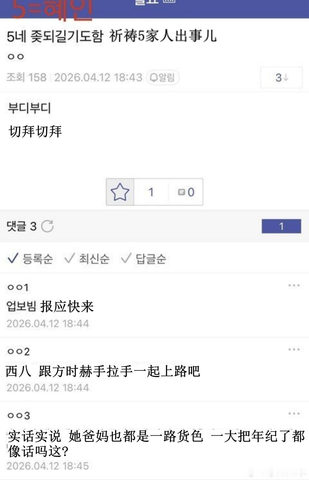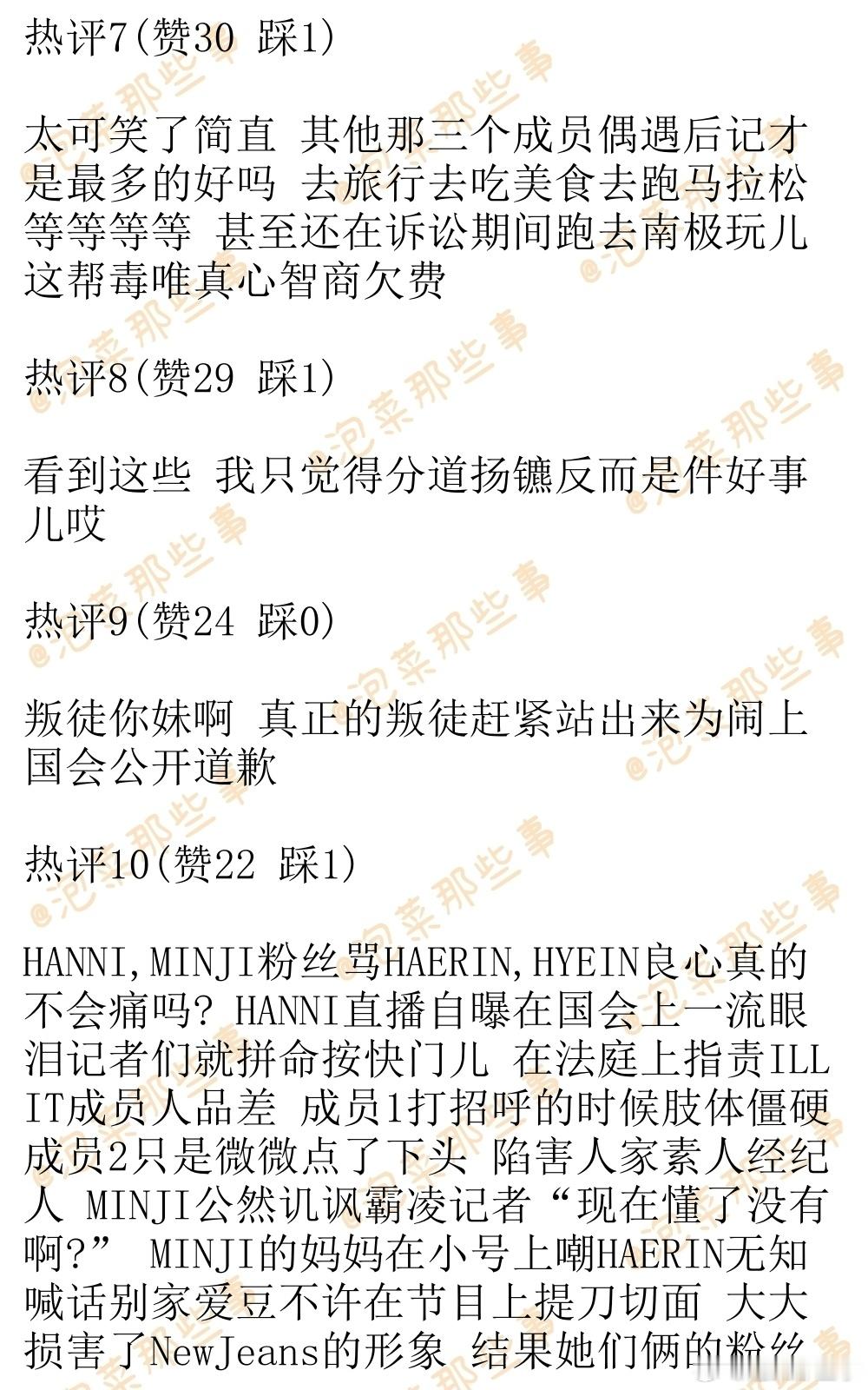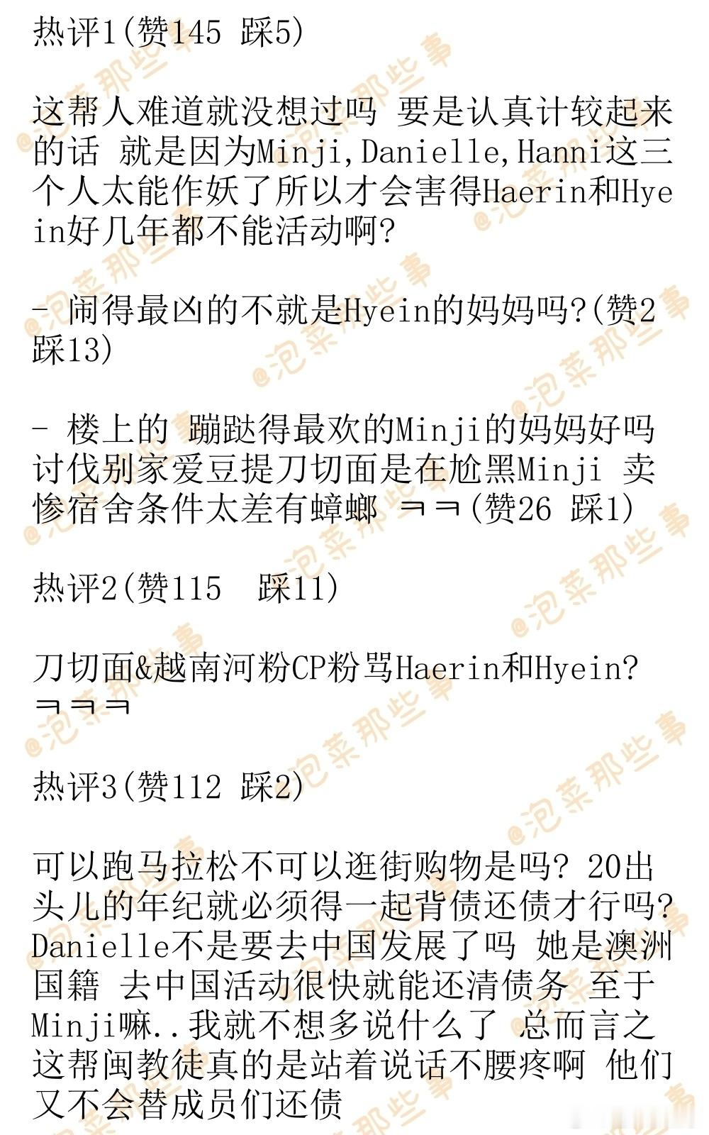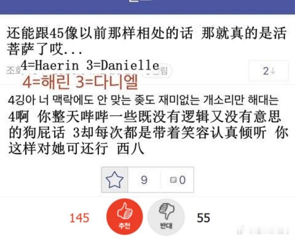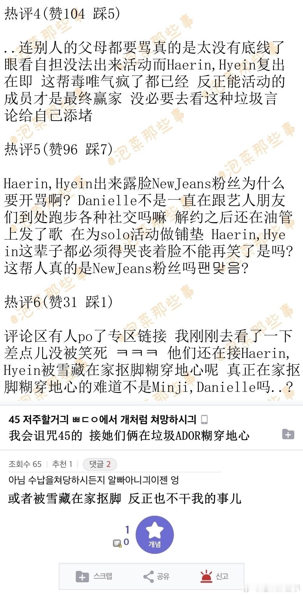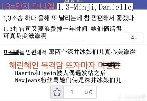 🔥韩网热帖评论翻译🔥NewJeans粉丝大骂姜海粼李惠仁 太恐怖了简直韩网原帖帖主称:Haerin和Hyein被人偶遇发帖之后 由NewJeans粉丝+ 闵熙珍粉丝构成的dc论坛专区对她们俩破口大骂 超绝双标 笑死人了简直(专区名字我给遮住了)整天嚷嚷着想要看到Danielle还有Minji被人偶遇 ㅠㅠㅠㅠ 然后每次看到有人偶遇Haerin和Hyein就会开骂开黑加入这个专区的确实都是NewJeans粉丝 因为需要上传NewJeans专辑周边作为认证 他们都坚持认为Minji,Danielle,Hanni一点儿错都没有 为她们仨卖惨鸣不平 然后版主是Minji粉丝 公开宣称会一直骂Haerin骂到Minji宣布退团为止他们骂Haerin和Hyein背刺队友这一点真的是太让人无语了 成员们是一起跟嗨比面谈的啊 然后嗨比只把Danielle给开除了 然后Haerin和Hyein就被打成了叛徒 ㅋㅋ 她们俩怎么可能知道Danielle会被开除啊? 而且要是按这个逻辑的话 那在知道Danielle被开除之后还是选择回归嗨比的HANNI才是最大的叛徒啊 但是这帮人又帮着Hanni尬洗 说她是外国绿卡 什么都不知道 处境非常可怜cr.pann