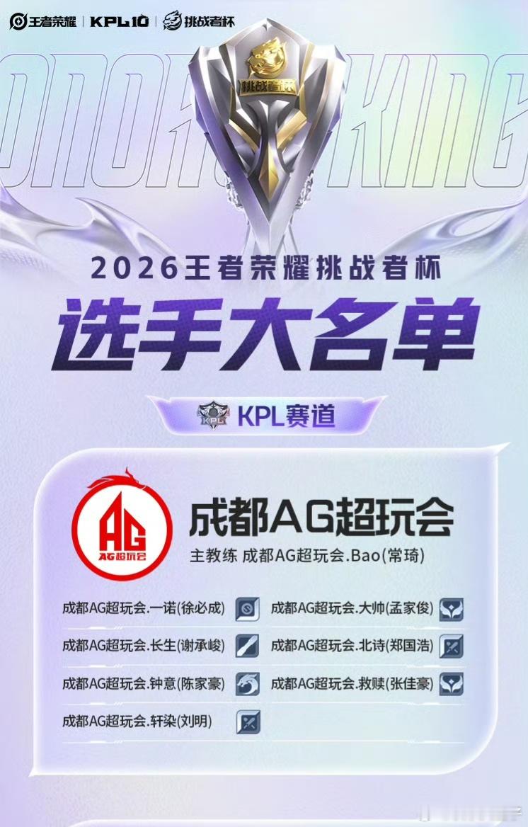 一诺确认挑杯回归 AG一诺回归 大王你终于回来啦挑战者杯公布选手大名单,一诺确认挑杯回归!AG首场比赛将在4月26日21点对战RW。2026挑战者杯大名单AG超玩会