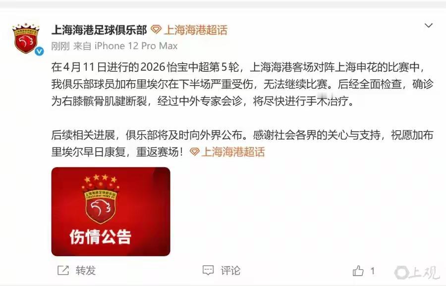 2,加布里埃尔,上海德比中受伤,确诊为右膝髌骨肌腱断裂,大概率将缺席半年甚至更久。