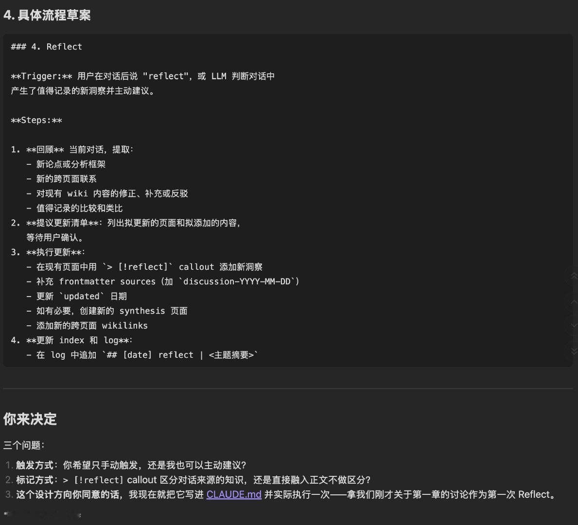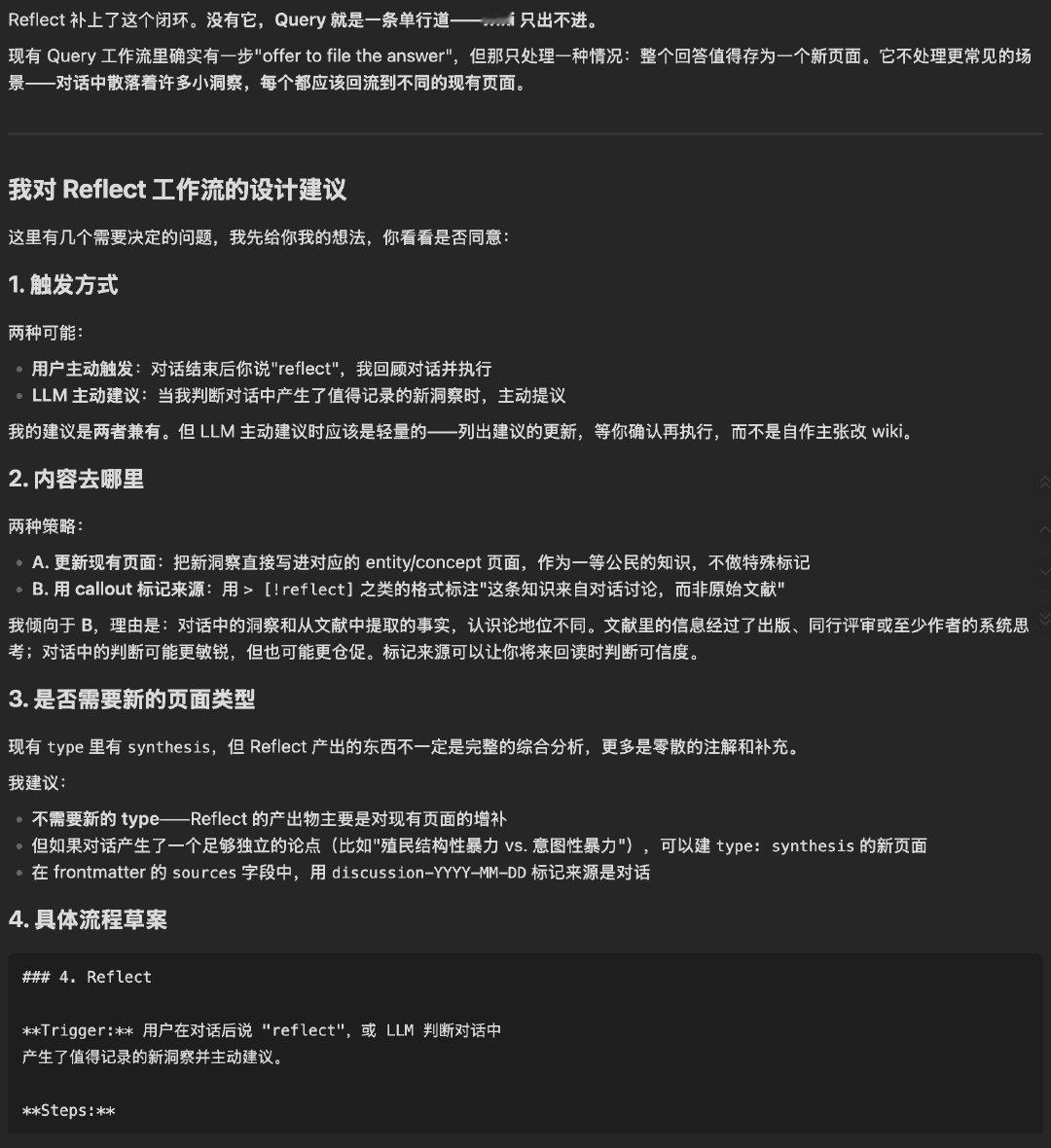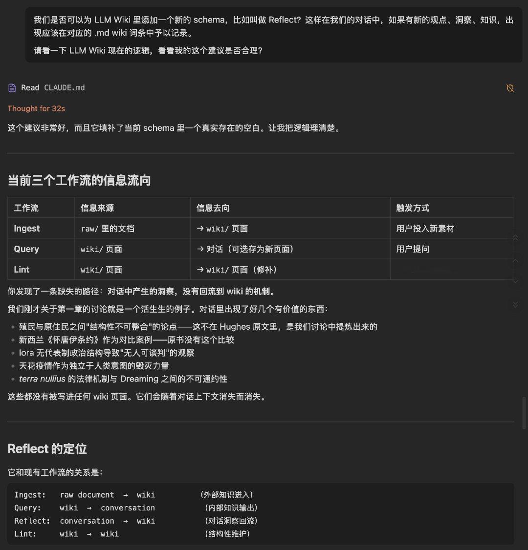 为 LLM Wiki 策略增加了一个新的 Reflect schema,和 Claude 的讨论过程供参考。在 CLAUDE.md 里新增的段落如下:
