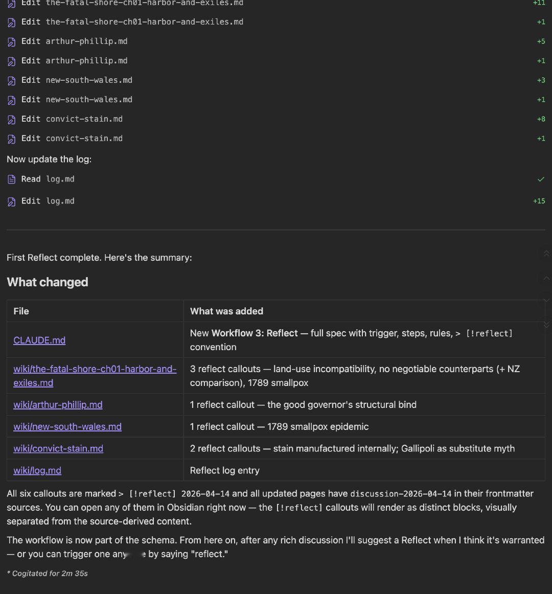 **Rules:**- Never fabricate insights that were not actually discussed. Reflect records what emerged from the conversation, not what the LLM thinks should have been discussed.- The `> [!reflect]` callout is sacred: it means "this came from a human-LLM discussion, not from a raw source." Do not use it for source-derived content.- When in doubt about whether an insight is significant enough to record, ask the user.- Reflect can be combined with Query: if a query conversation produces novel insights, the LLM may suggest a Reflect at the end.