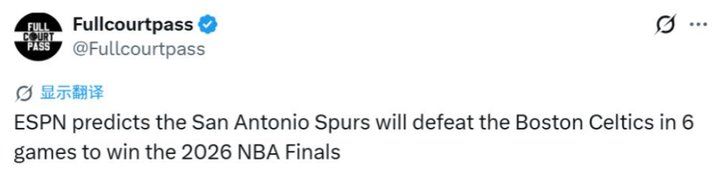 4月14日,ESPN对2025-26赛季的NBA季后赛展开全面预测,最终,他们认为马刺会成为本赛季的总冠军,他们将在总决赛4-2淘汰凯尔特人,22岁的文班亚马成为总决赛MVP。