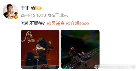 于正为凤不栖开机打call于正期待吴谨言许凯新剧谁和我一起等!于正为凤不栖开机打 call,期待吴谨言《凤不栖》,也期待许凯《方圆八百米》。
