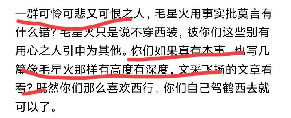 有人嘲笑毛星火的“不穿西装”誓言,有同样批莫言的网民受不了啦:你们如果真有本事,也写几篇像毛星火那样有高度、有深度,神采飞扬的文章看看?