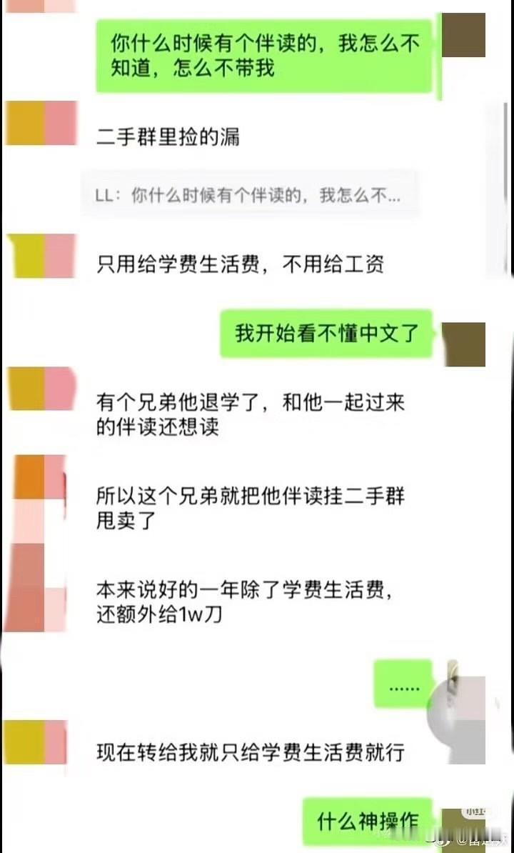 富二代在国外留学2年,虽然平时作业、考试都是这个伴读代劳,还是觉得国外太寂寞了,不如国内精彩,索性退学不读了。但这个伴读有些想法,希望能够读完拿到学位。这个富二代于是在群里“转卖”伴读,没想到还真有人接盘,负责接下来几年伴读的学费和生活费,每年的1万美元则是由富二代继续承担。