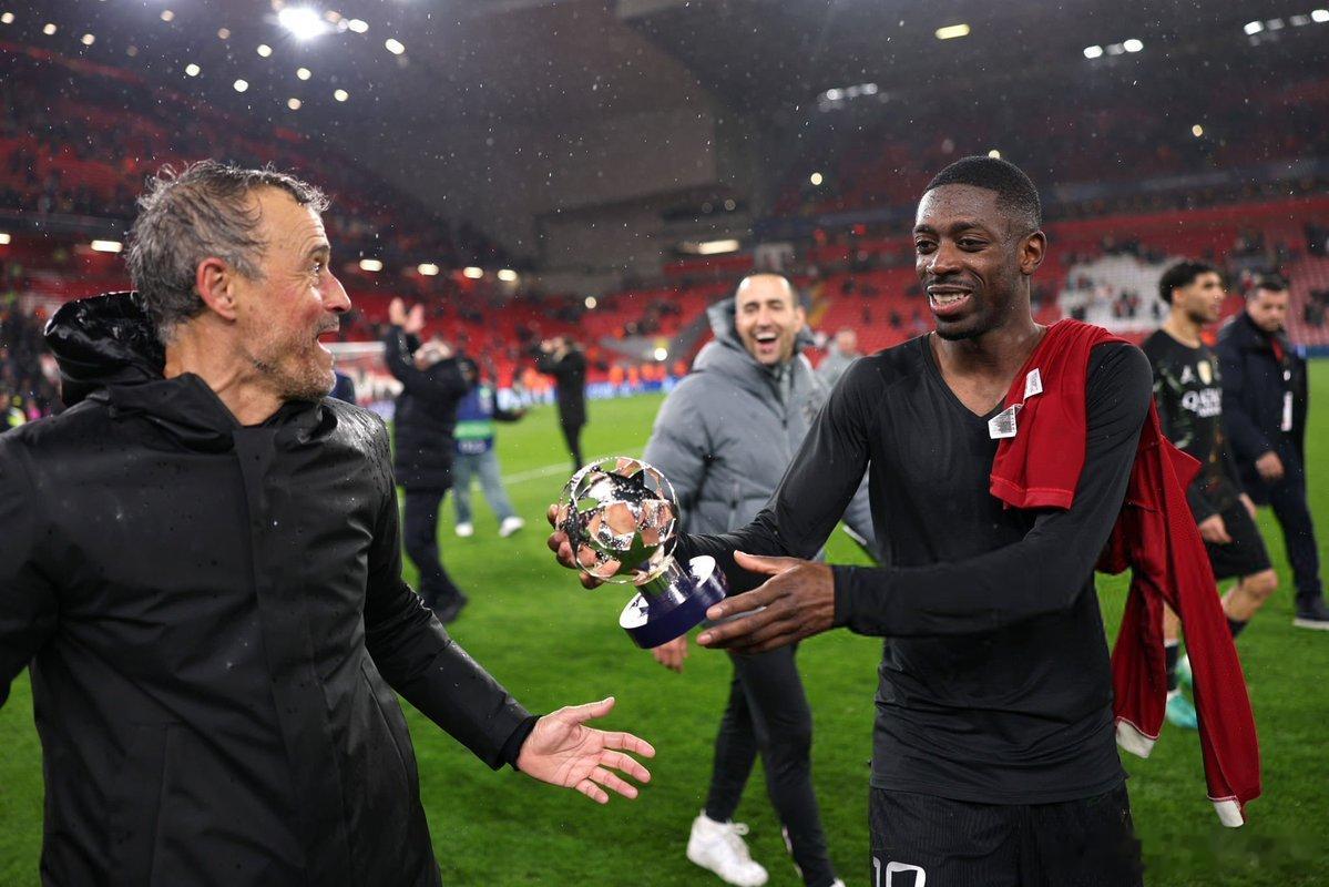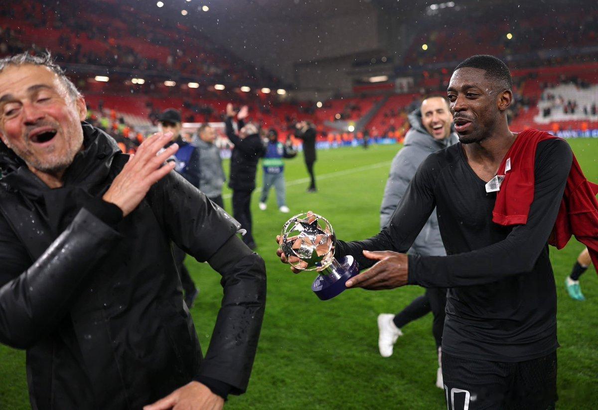 Ousmane Dembele of Paris Saint-Germain presents the Player of the Match award to Luis Enrique 😂❤️ 利物浦0比2巴黎圣日耳曼