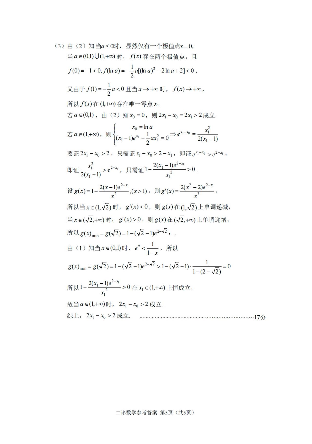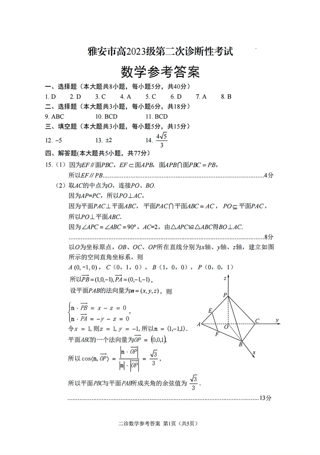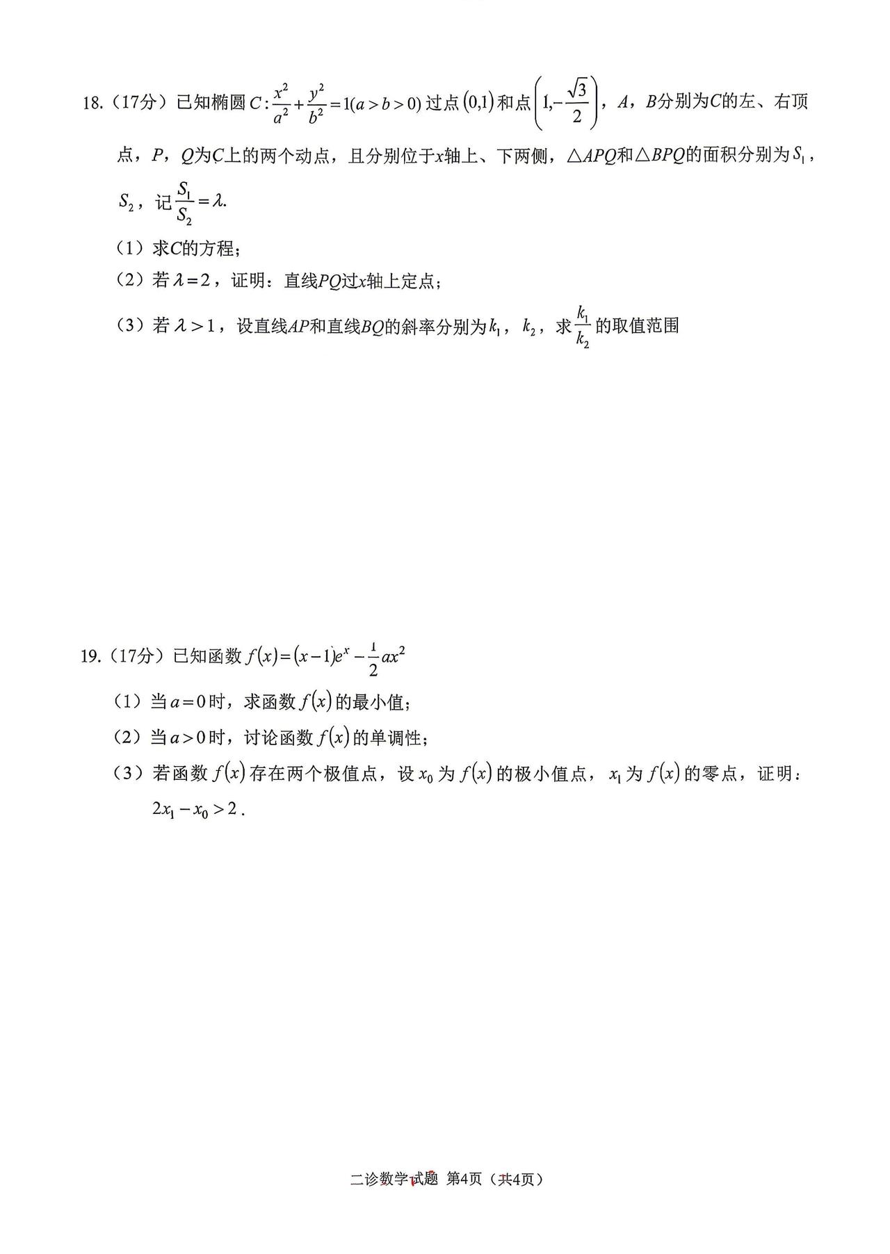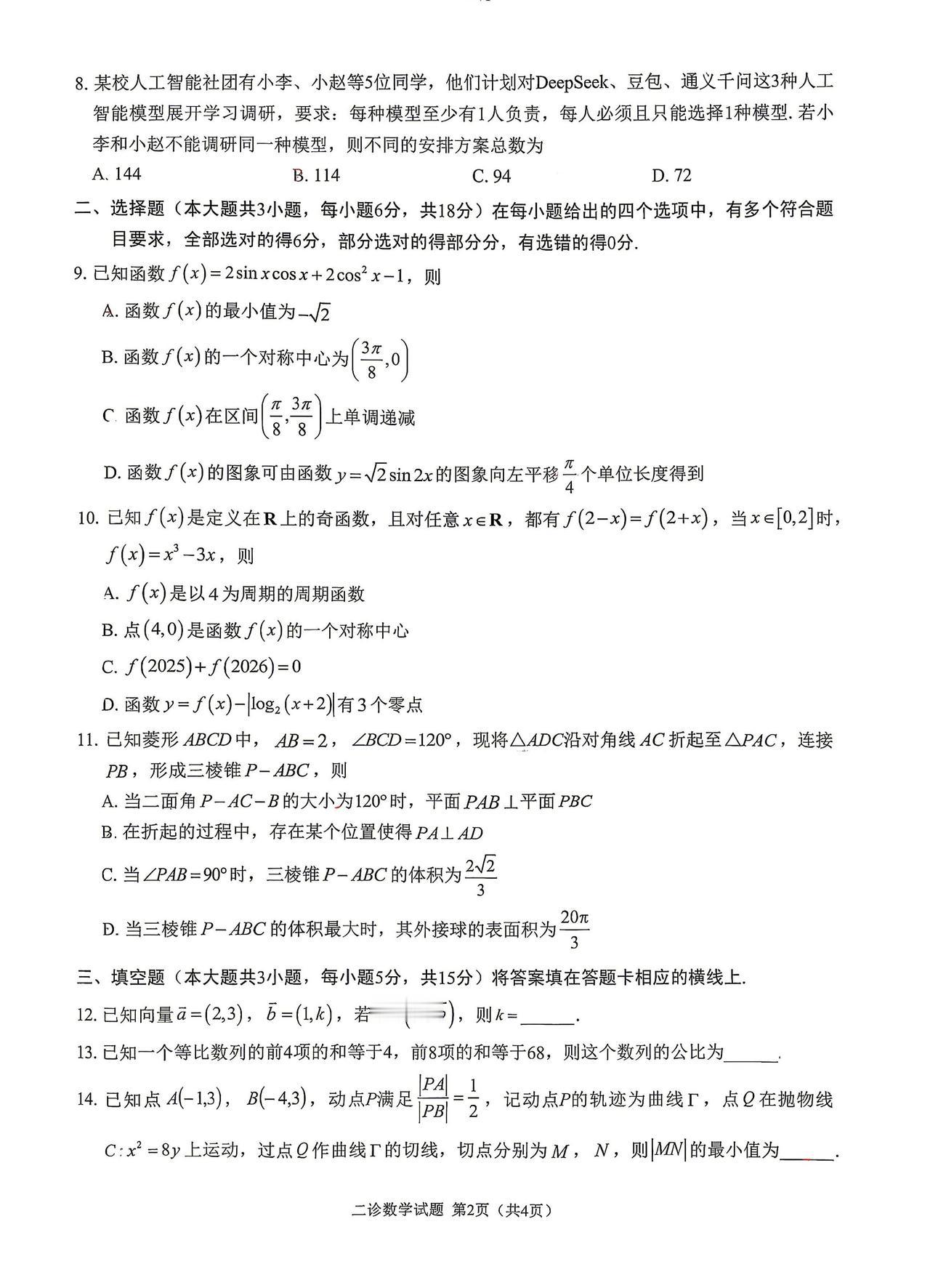 四川省雅安市2026届高三4月二诊考试数学试题及答案