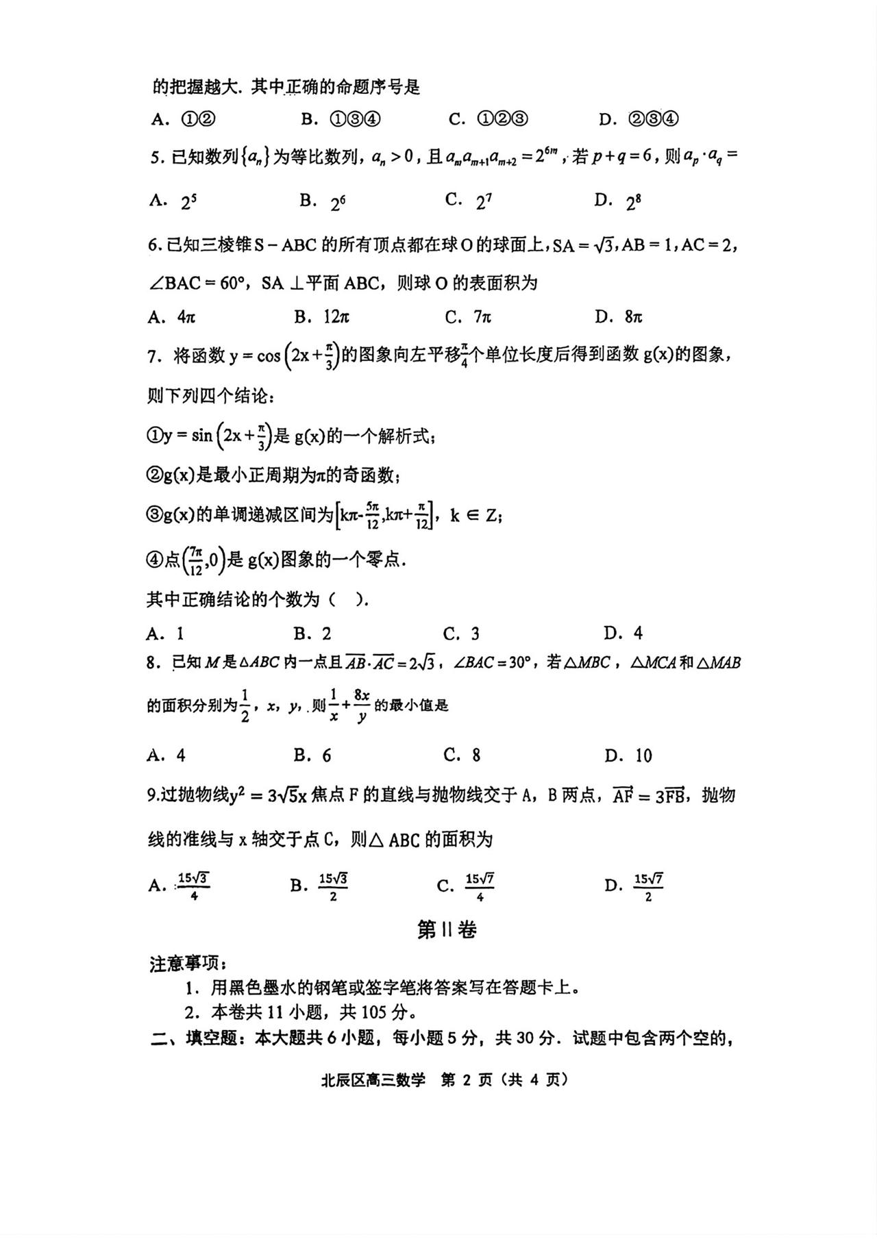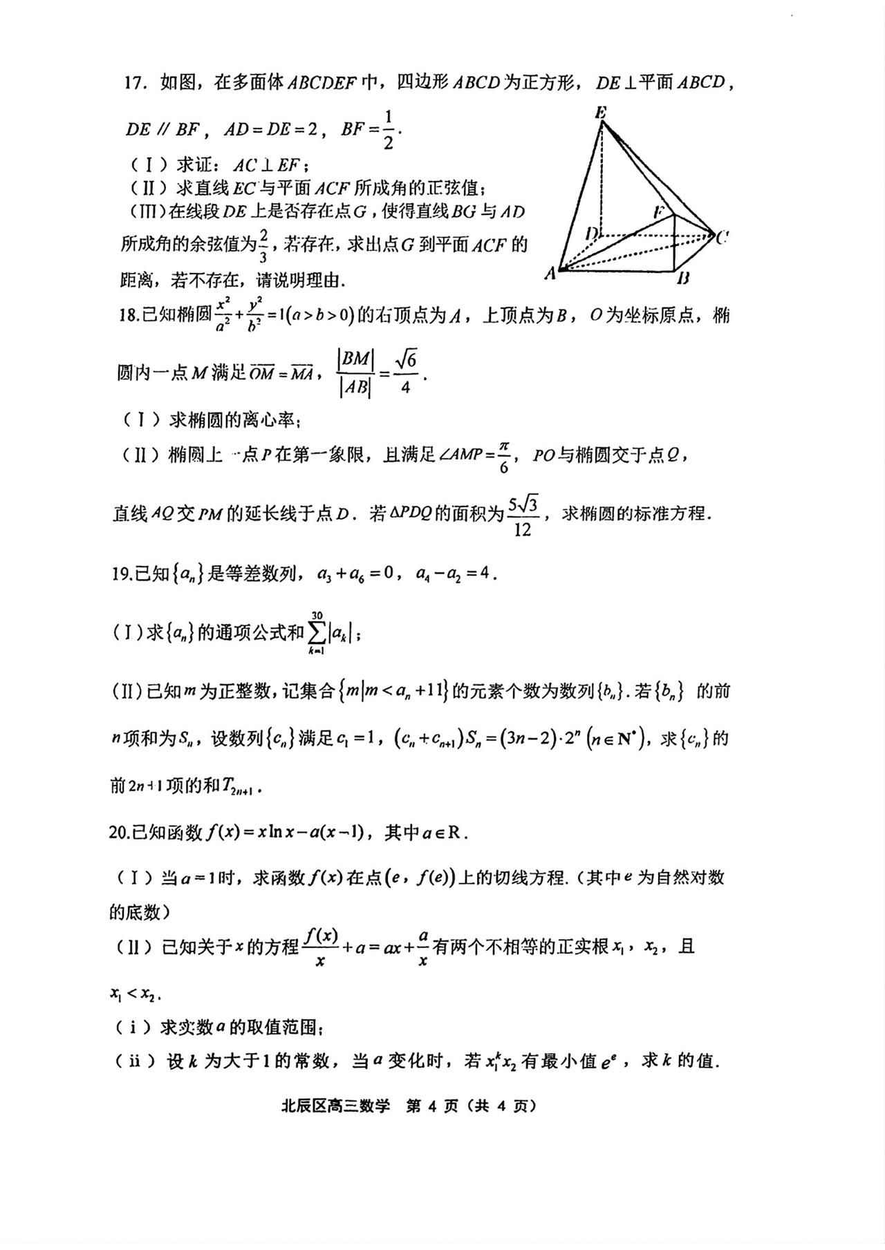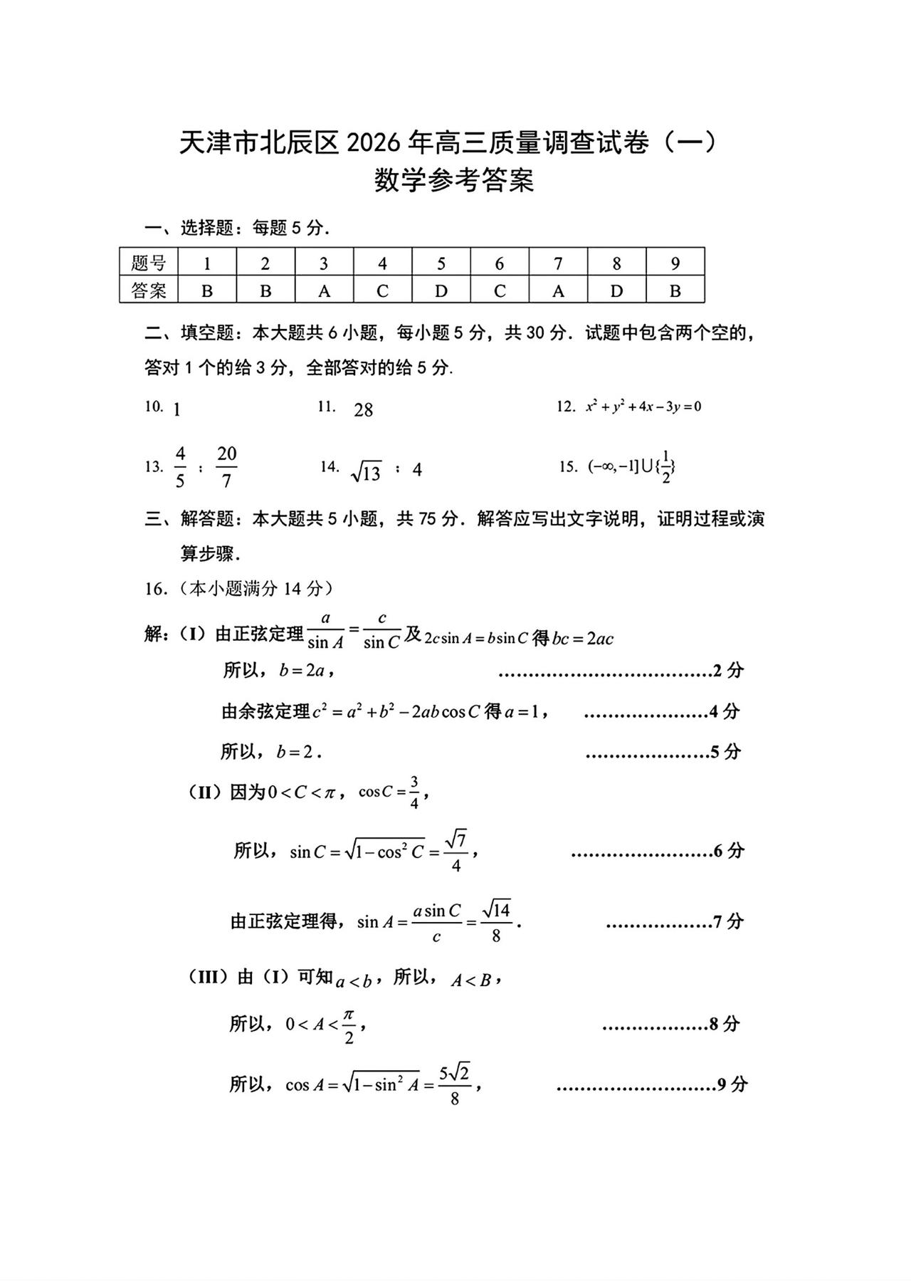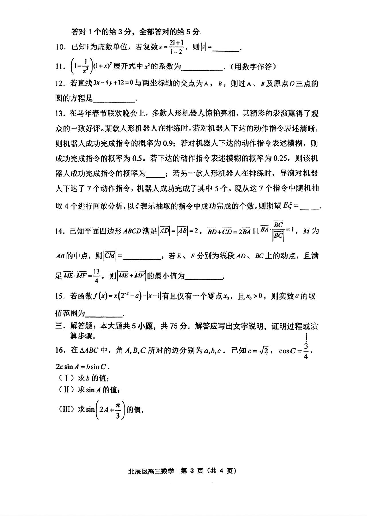 天津市北辰区2026届高三4月一模考试数学试题及答案