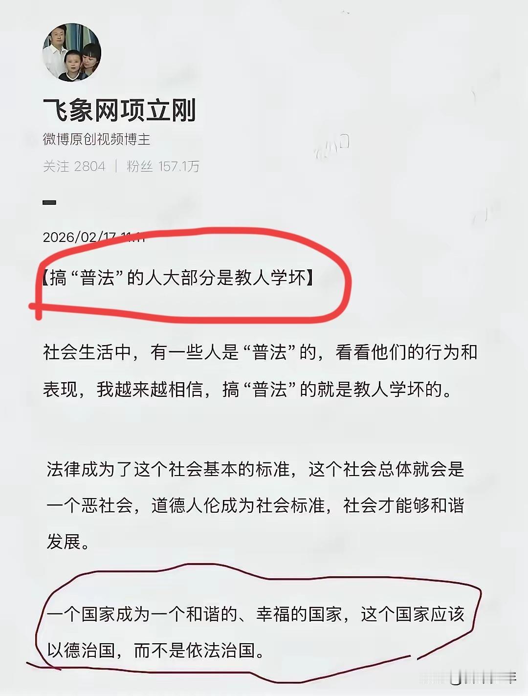 项立刚的观点太离谱了:普法是教人学坏—— 项立刚说“普法是教人学坏”,这是对法