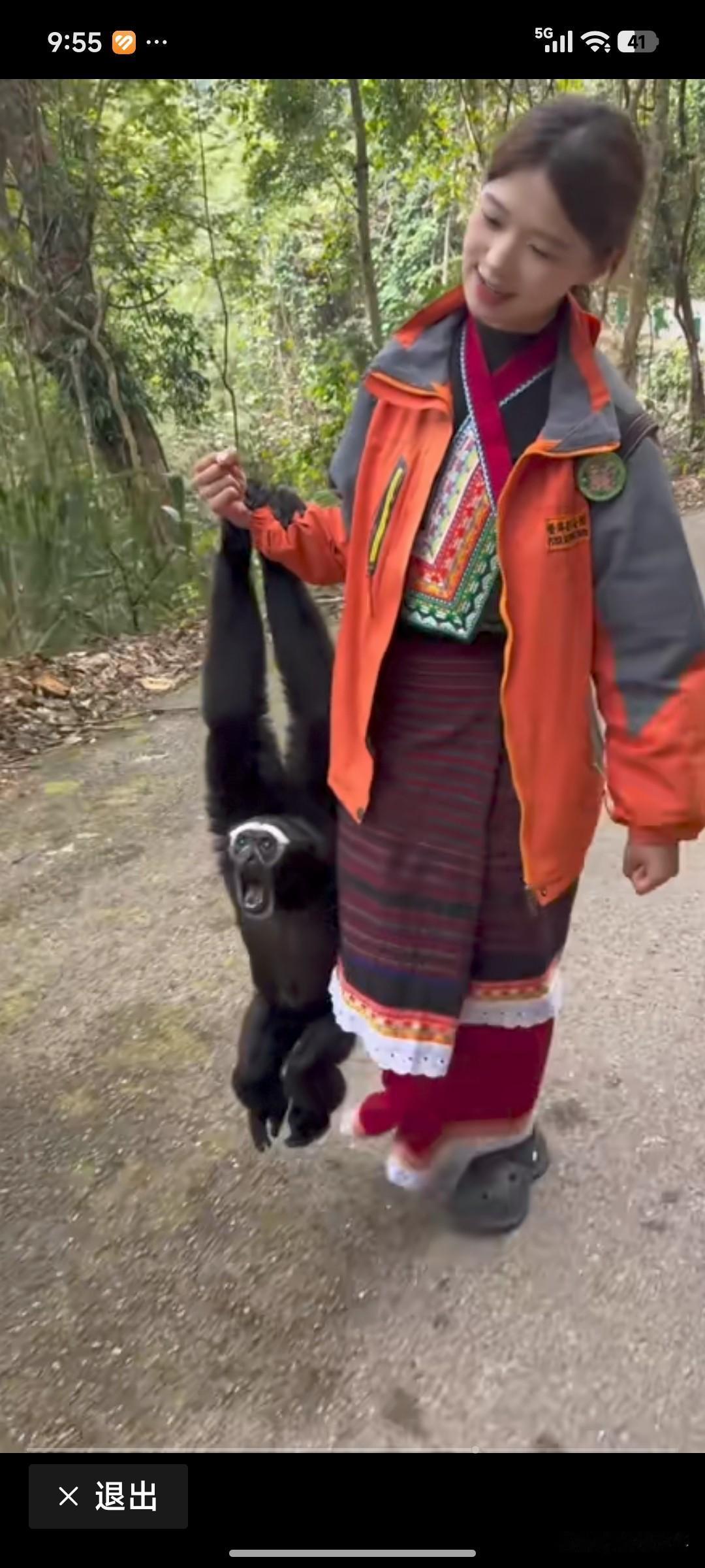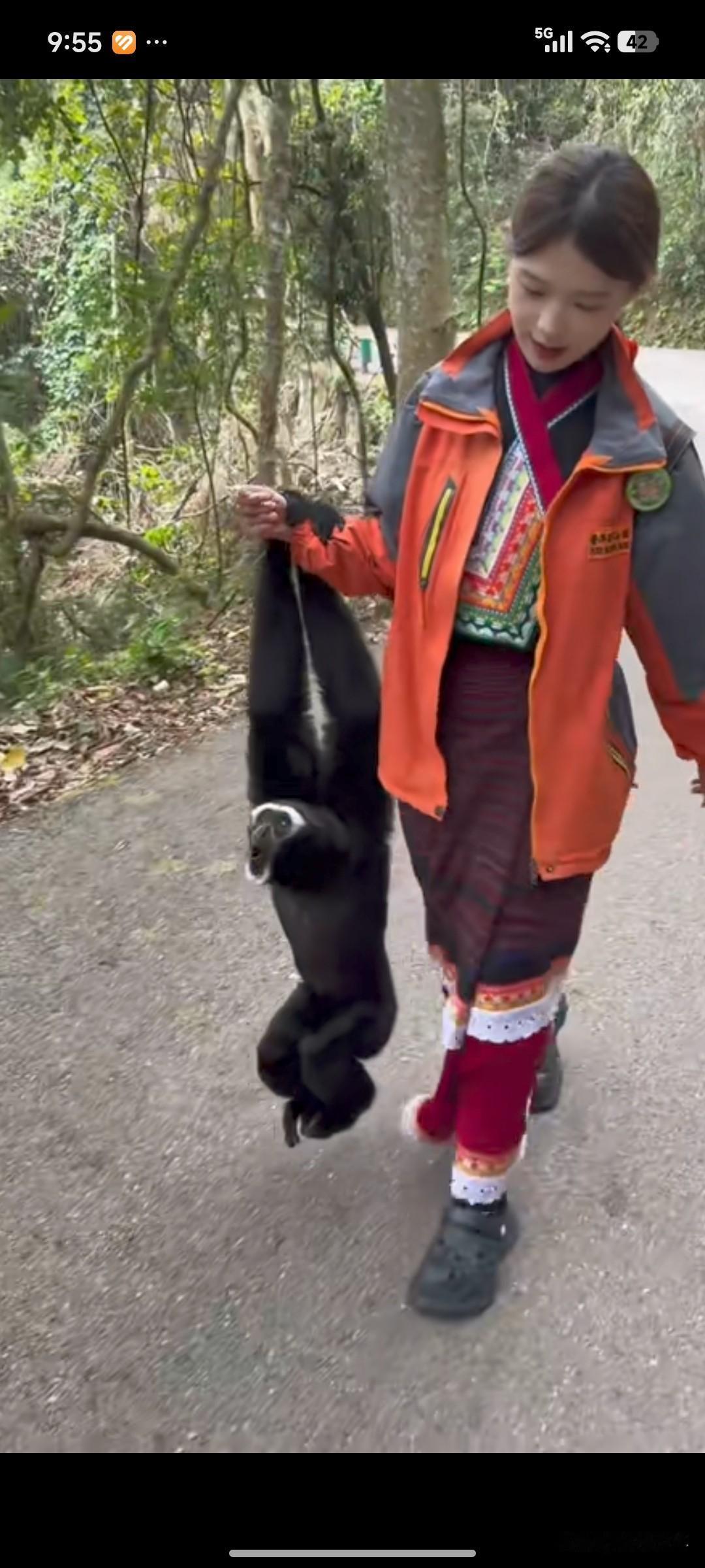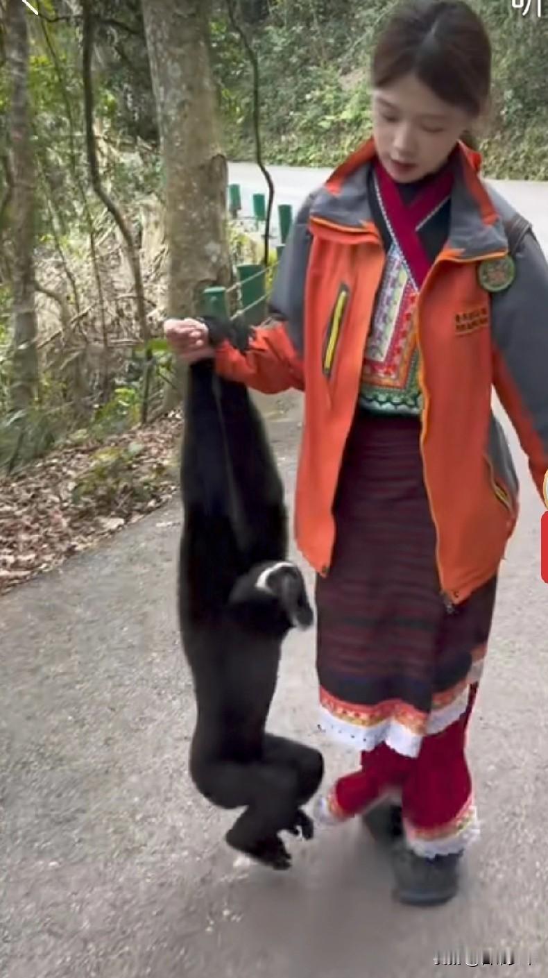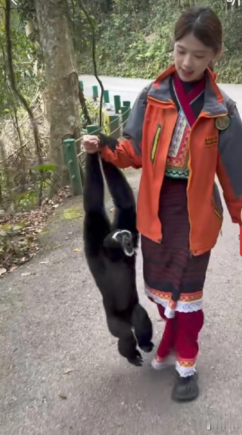视频的背景应该是云南高黎贡山的白眉长臂猿保护区,这位姑娘自然是独龙族管理员。她每天与国家一级保护动物白眉长臂猿相伴,画面和谐又温馨。