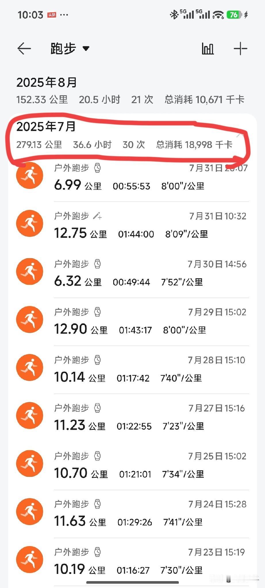 在三百六十五天里,超六成的日子,老夫都与跑鞋为伴。盛夏七月更是一天不落跑满全勤,单月近300公里的跑量,是汗水浇铸的勋章。从5公里的轻松晨跑,到马拉松的极限挑战,脚下的每一步,都是一个七旬跑者的热爱和不服老的证明。