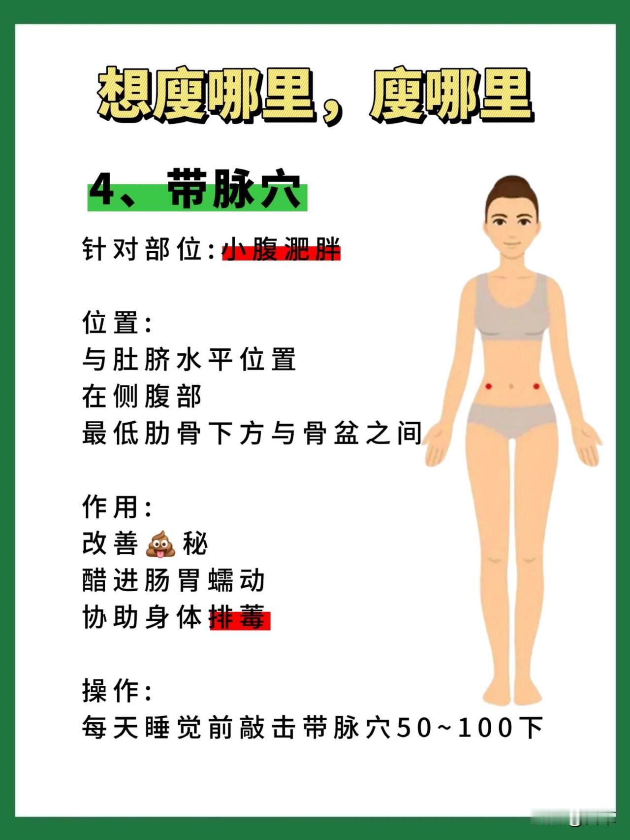 它能改善便秘,促进肠胃蠕动,帮身体排出毒素,对小腹肥胖、便秘型肥胖超实用。每天睡前轻轻敲击带脉穴50-100下,坚持下来小腹会慢慢变平。