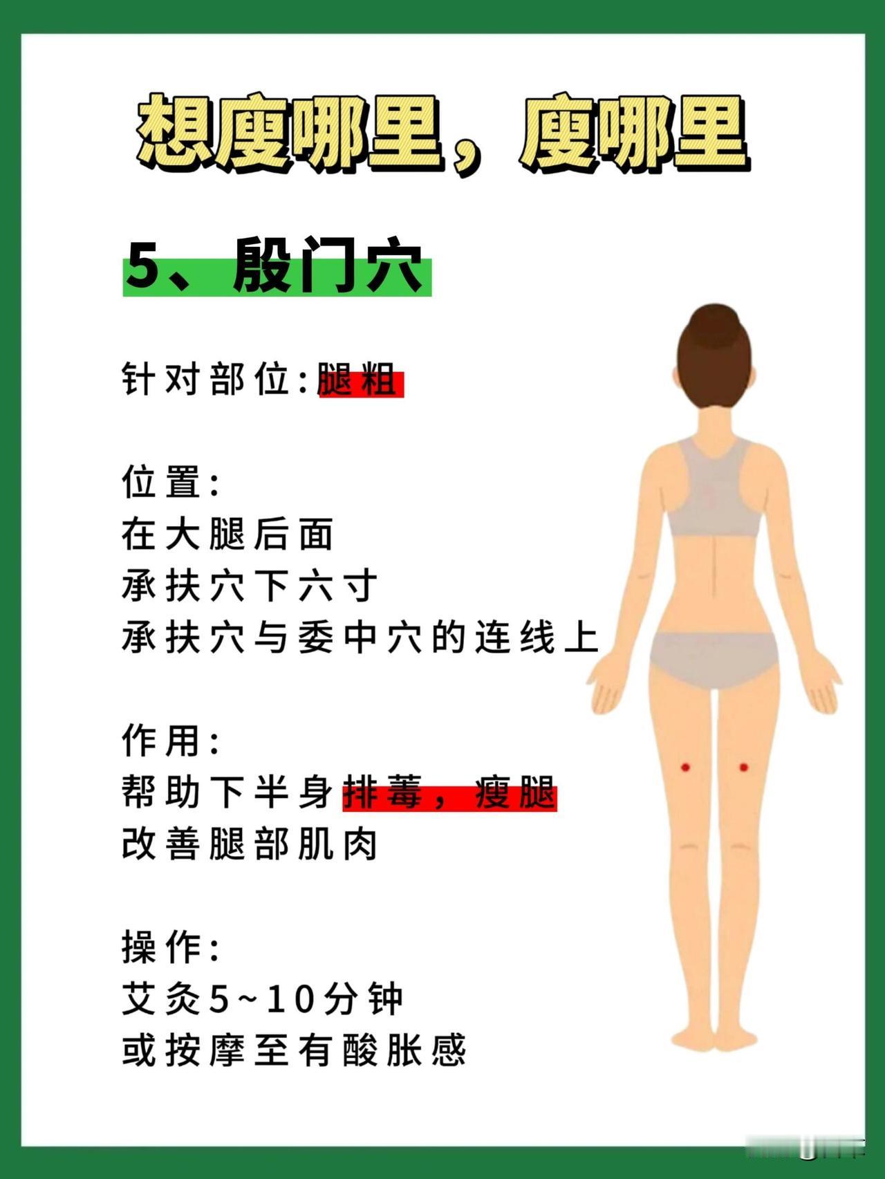 - 殷门穴在大腿后面,承扶穴下六寸的连线上,能帮下半身排毒、改善腿部肌肉,按摩至有酸胀感,或艾灸5-10分钟都可以;