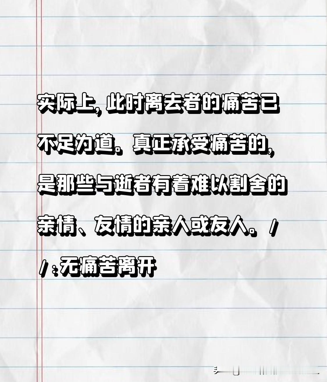 实际上,此时离去者的痛苦已不足为道。真正承受痛苦的,是那些与逝者有着难以割舍的亲情、友情的亲人或友人。