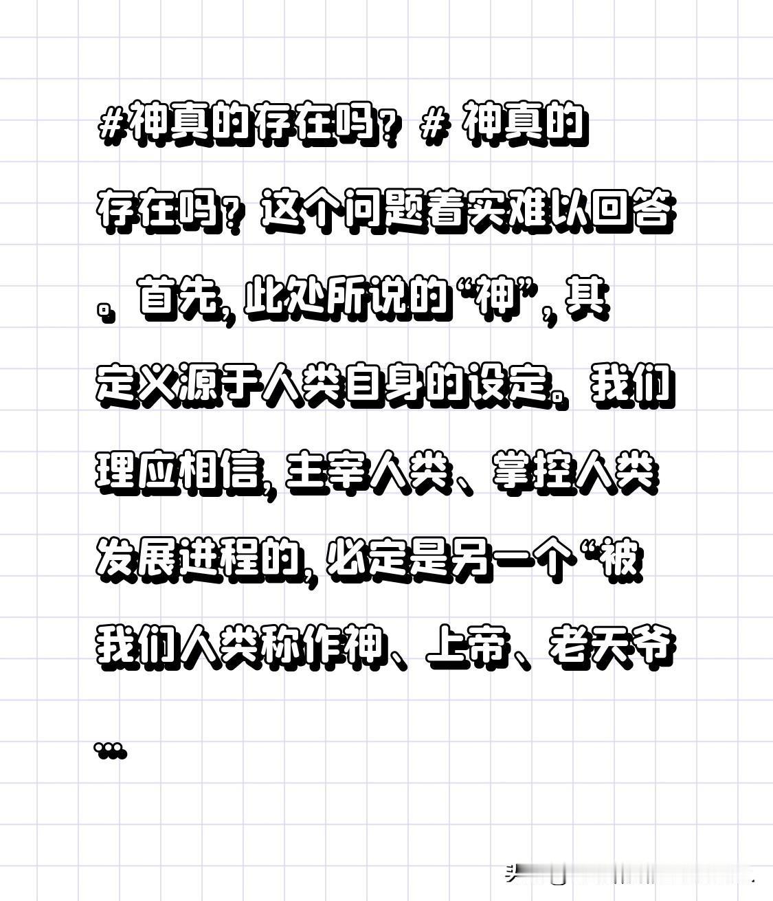 神真的存在吗?这个问题着实难以回答。首先,此处所说的“神”,其定义源于人类自身的设定。我们理应相信,主宰人类、掌控人类发展进程的,必定是另一个“被我们人类称作神、上帝、老天爷等”的存在,它控制、编辑、修改着人类的代码,也就是掌控着人类。由此引申而言,这个人为设想的“神”,或者说前面所提及的存在,应当是存在的。不然,人类的一切怎会被“它们”左右与摆布呢!