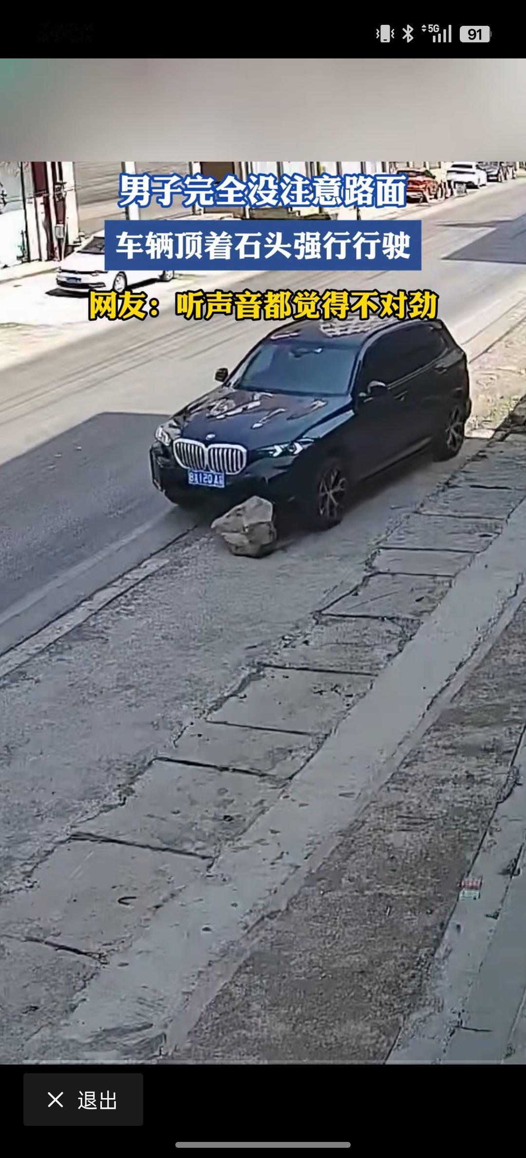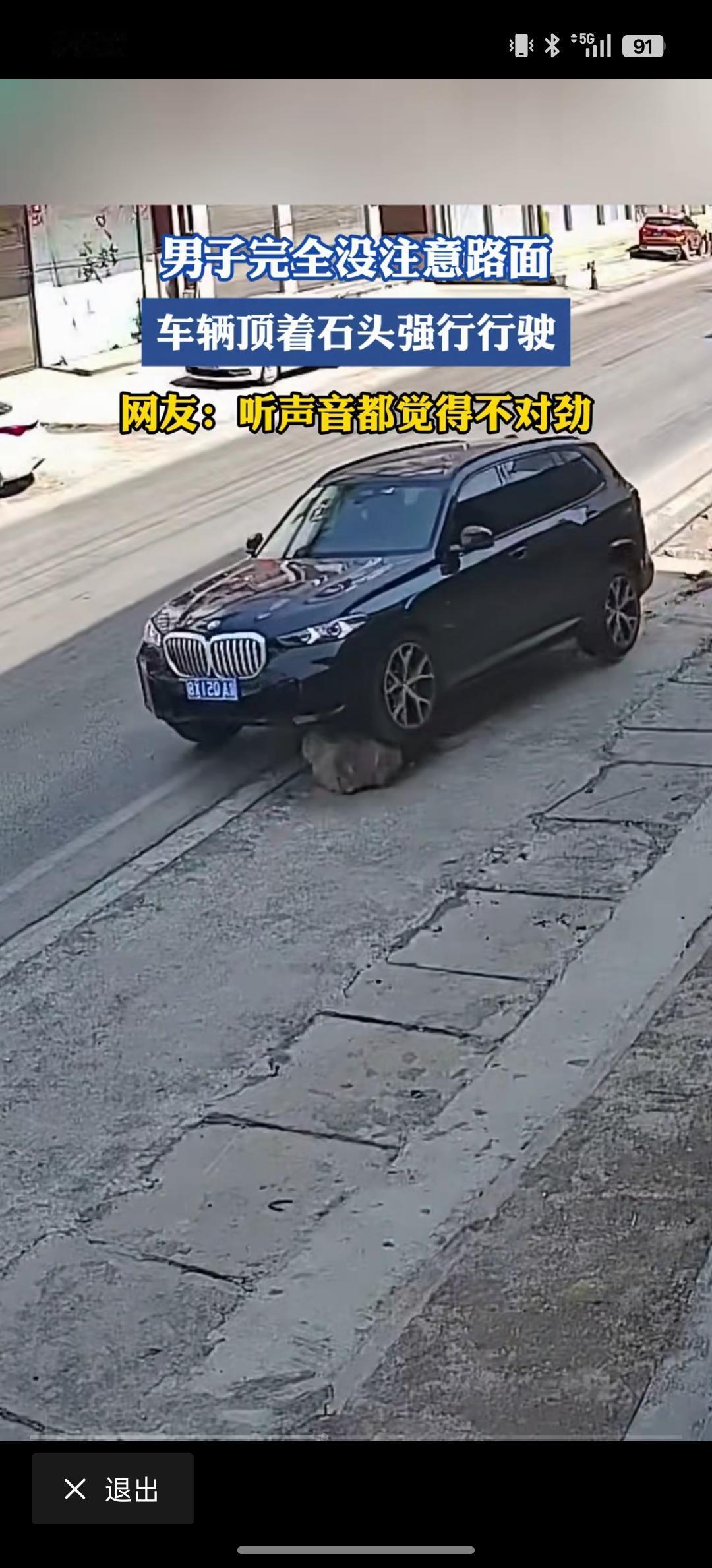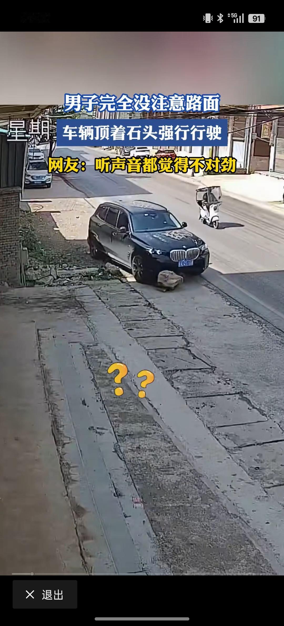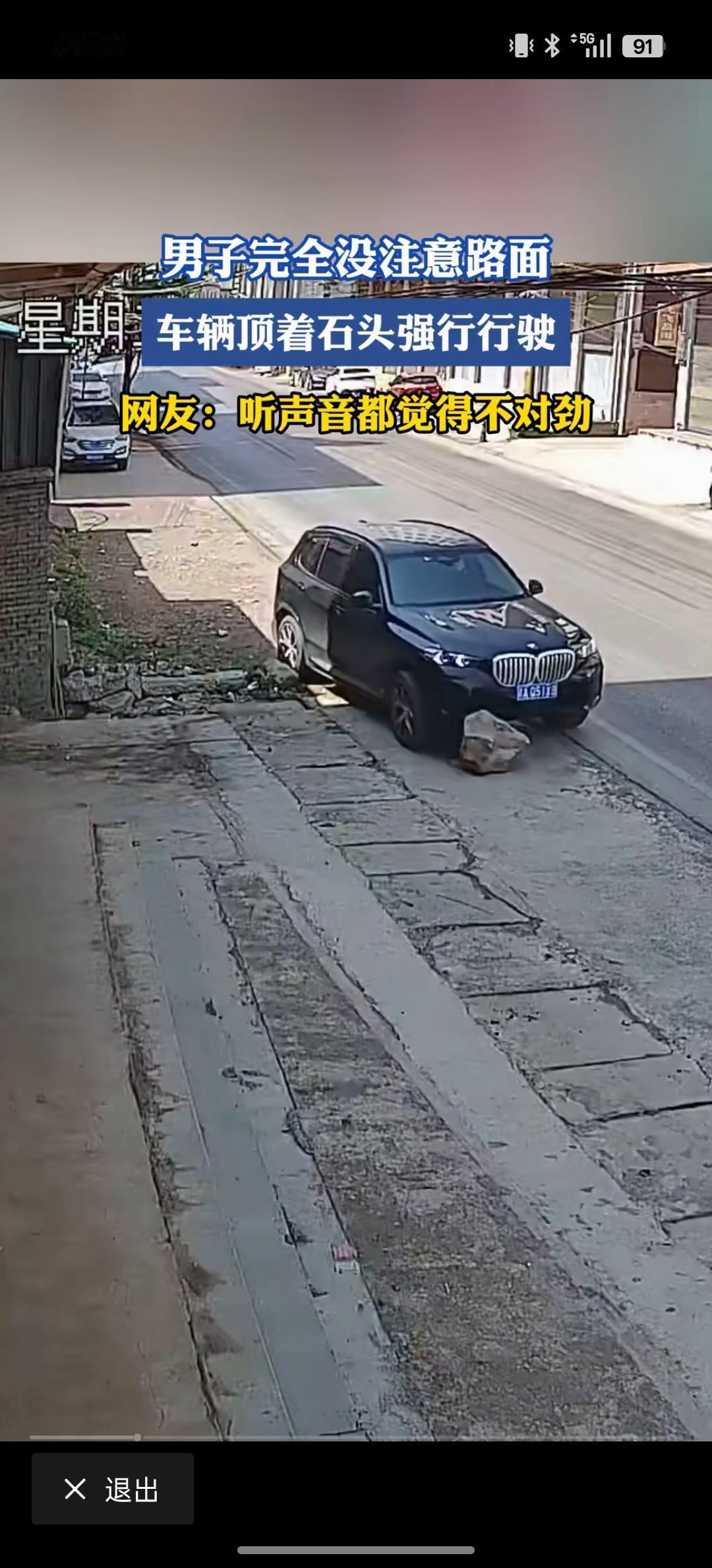 宝马车往前开不动,顶着一块石头,居然不知道下来查看,一直开着车推着石头走。后来走