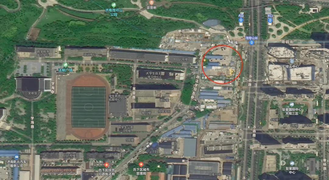 从地图上能够看到,该地块具体位置大约位于山东政法学院以东,政法学院东巷附近,紧邻济南地铁6号线茂陵山站。