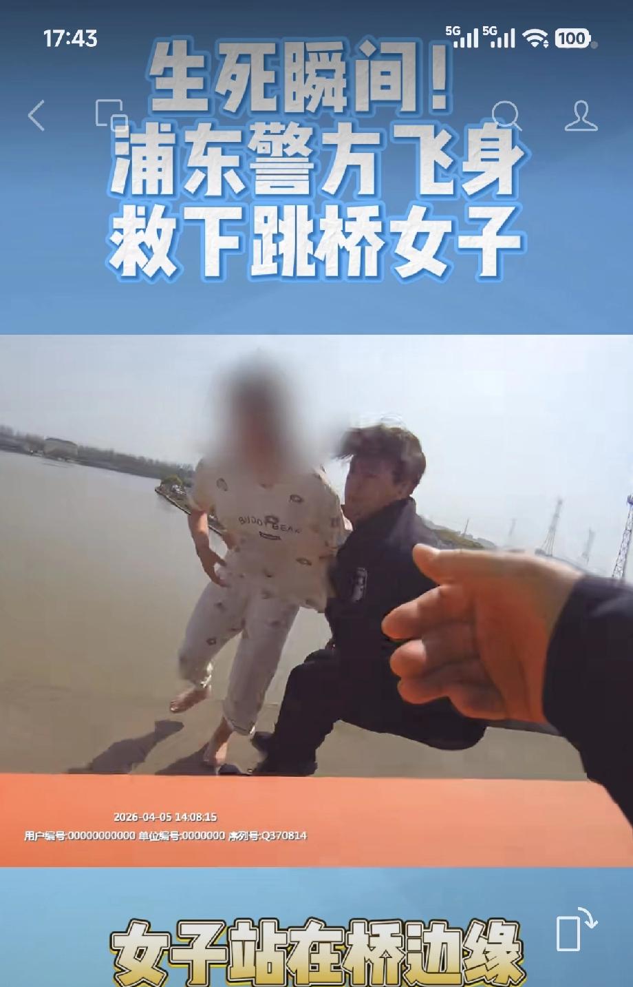 4月5日下午,浦东一座跨河桥上,一名女子赤脚站在护栏外,半个身子悬在河面,随时可能坠河。