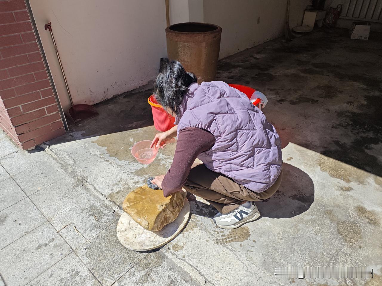 先刷酸菜缸(见图5),又刷压酸菜的大石头(见图6),我不停地往外倒废水,媳妇又把地面收拾了,一切归置完毕,累得够呛,但也不能歇着,还要连续作战包包子。