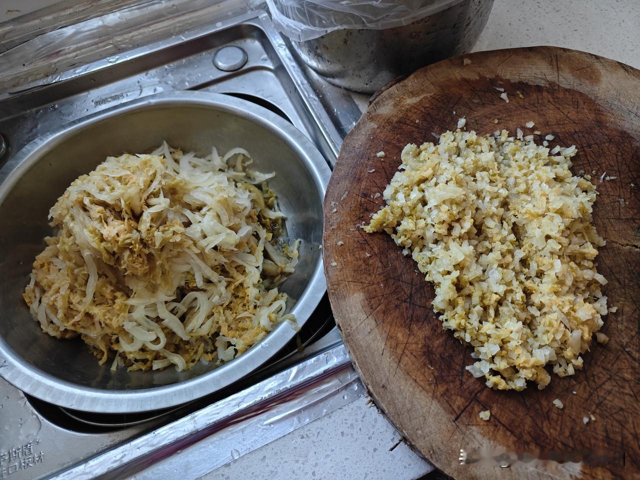 我把8棵酸菜都洗干净了(见图7),媳妇收进冰箱5棵,剩下的3棵小的,我先切丝,后剁馅(见图8)。前几天买的五花肉不好,有脆骨,绞肉机绞不动,我怒从心头起,把那肉放在菜板上一阵狂剁,我就不信剁不烂它。