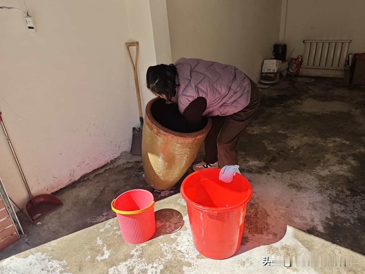 回家弄水准备刷酸菜缸,我和媳妇又发生了冲突。我的意思是把装水的塑料桶放在买菜车上,一人扶着,一人拉着走,媳妇却说桶大,买菜车拉不了,犟不过她,只好和她两人抓着桶沿,抬着桶走。路上歇了好几气,心里抱怨,本来不该挨这个土鳖累,媳妇偏得要这么干,有什么办法?媳妇也是累得满腹怨言,你出的好主意,怨谁?木匠做枷,你自作自受去吧!