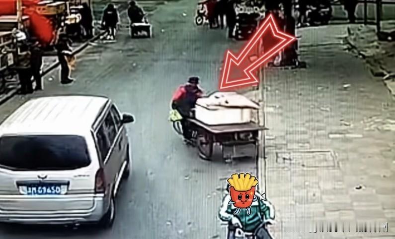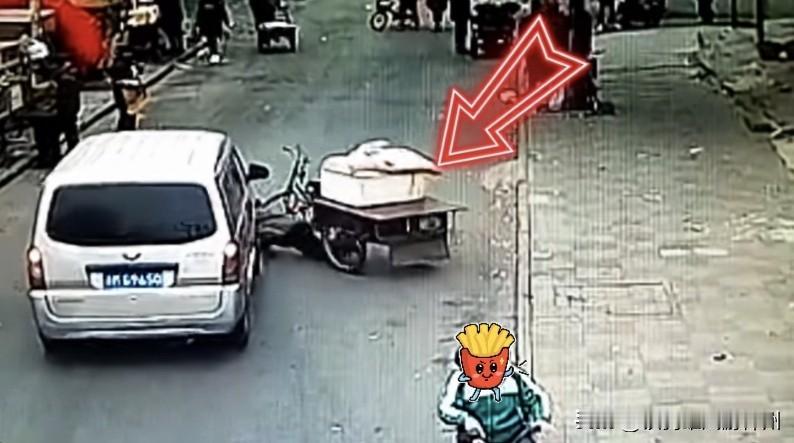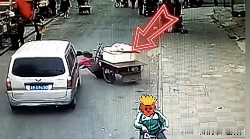 一位老太太,走在机动车道上,当她经过一辆三轮车时,本来静止的三轮车突然启动,失控左转,撞在老太太身上,把老太太撞倒,恰巧一辆面包车开上来,来不及停车,将老太太碾在车轮之下。
